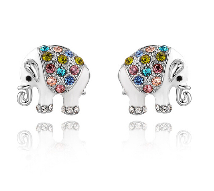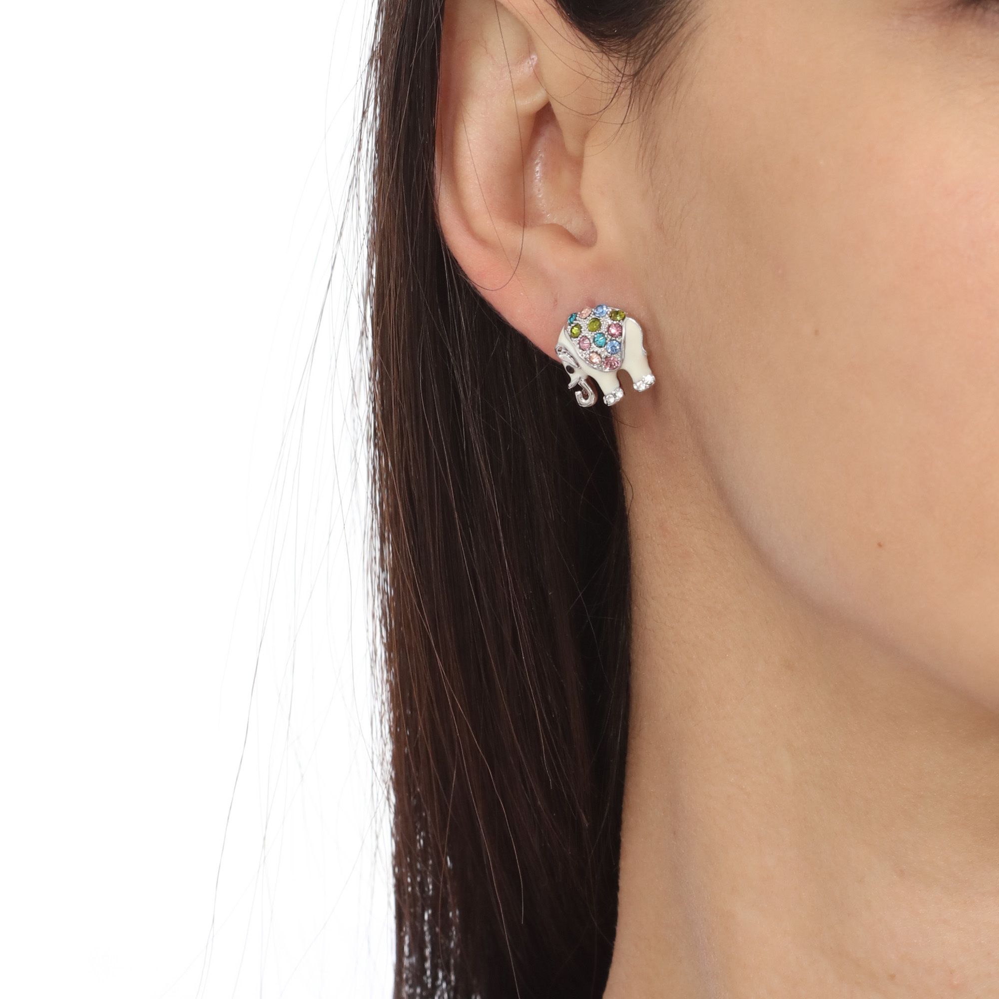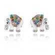 Hermosos aretes en baño de oro blanco de 18 quilates, diseño de elefante, con detalles en relieve, esmaltado blanco e incrustación de cristales en colores. Fabricado en una estructura de aleación de platino con rodio sin níquel