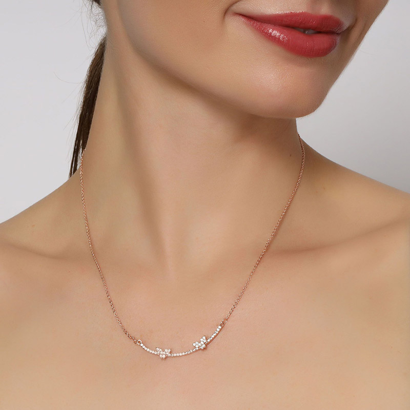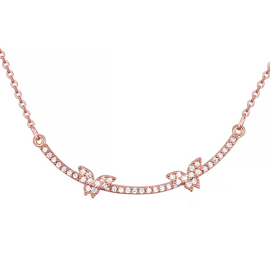 Lindo Collar en baño de oro rosa de 18 quilates, detalle de mariposas con incrustación de cristales en color blanco.