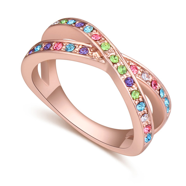 Anillo en baño de oro rosa de 18 quilates, fino diseño en forma de "X" con incrustaciones de cristales en colores.