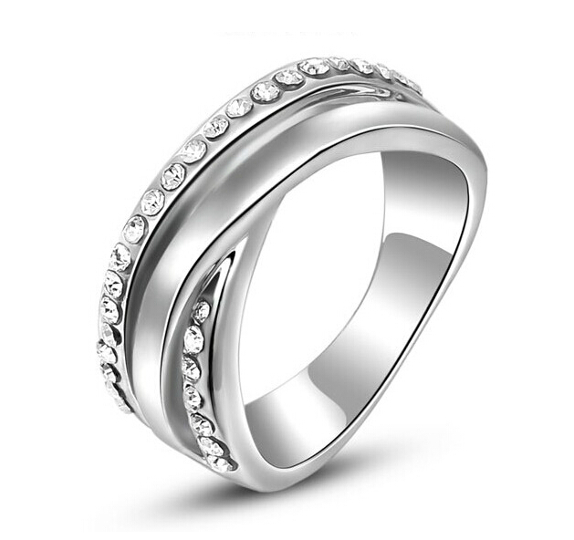 Anillo en baño de oro blanco de 18 quilates, original diseño entrelazado, con incrustaciones de cristales en color blanco.