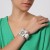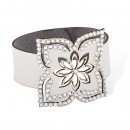 Brazalete en vinipiel color blanco, estilo muñequera, con diseño de flor e incrustaciones de cristales en color blanco.