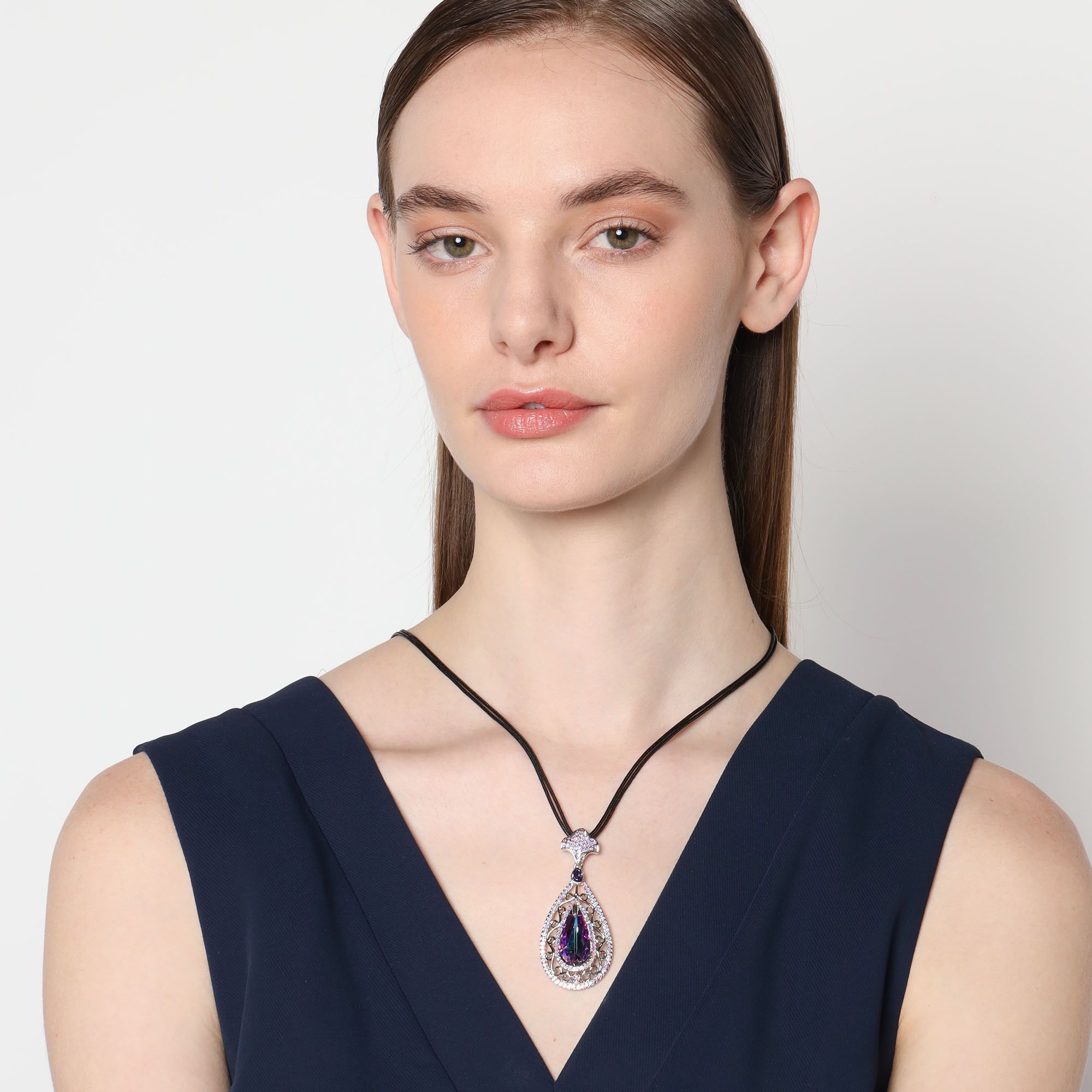 Precioso Dije en baño de oro amarillo de 18 quilates, diseño de gotas con incrustación de cristales en color tornasol y morado. Fabricado en una estructura de aleación de platino con rodio sin níquel. 1. joyería Hipoalergénica. 2. Incluye cajita de joyería. 3. Garantía de 30 días por defectos de fabrica.
