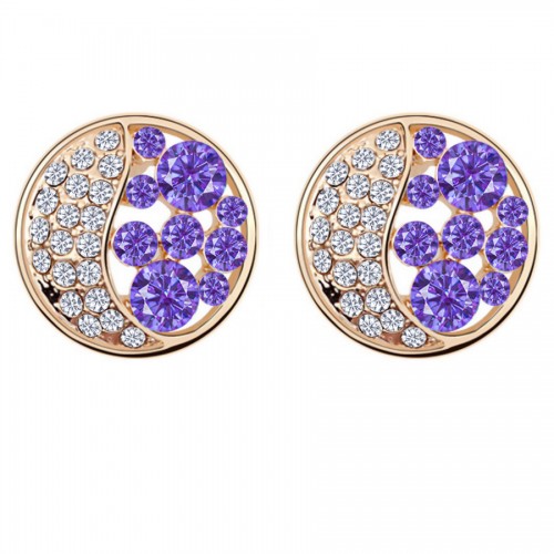 Hermosos aretes en baño de oro amarillo de 18 quilates, diseño de círculo, con incrustación de cristales en color morado y blanco. Fabricado en una estructura de aleación de platino con rodio sin níquel