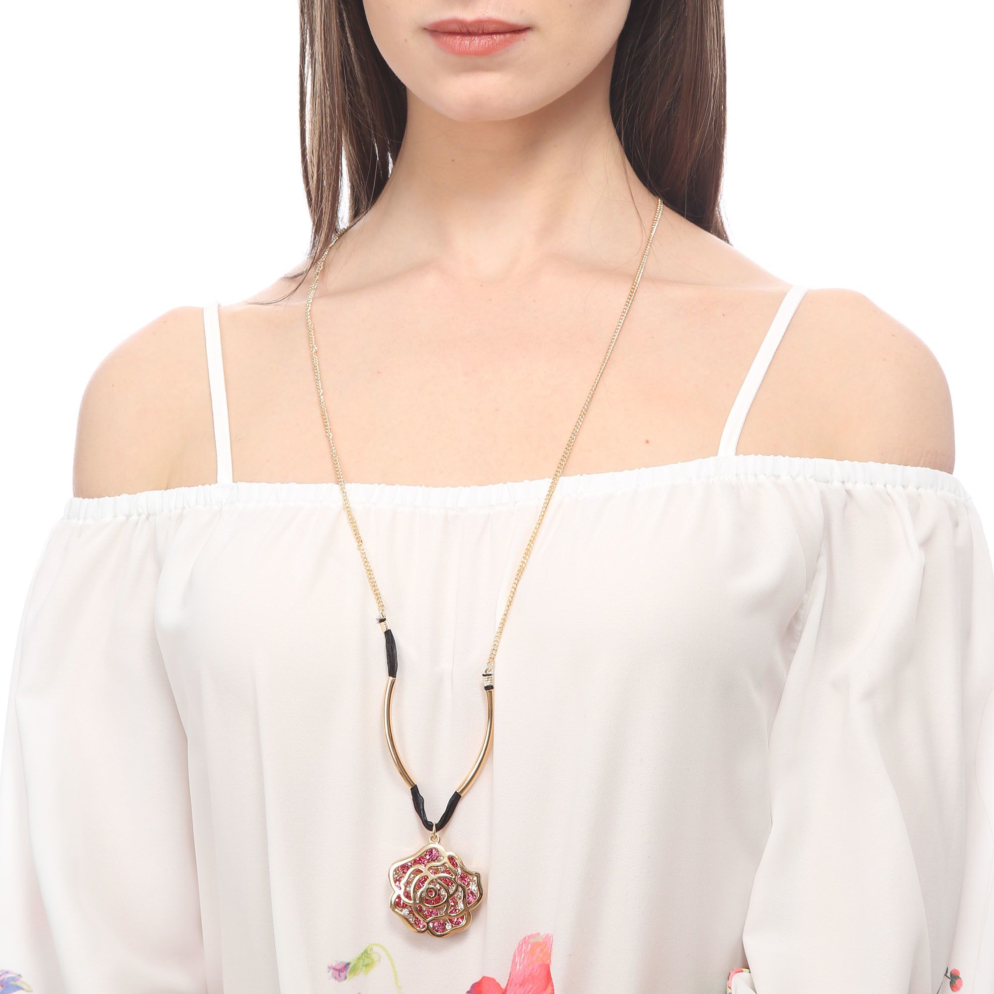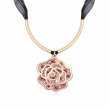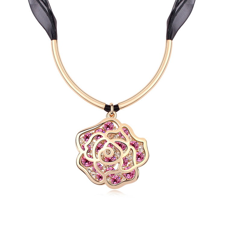 Elegante Collar en baño de oro amarillo de 18 quilates, diseño de flor con incrustación de finos cristales en color blanco y rosa.