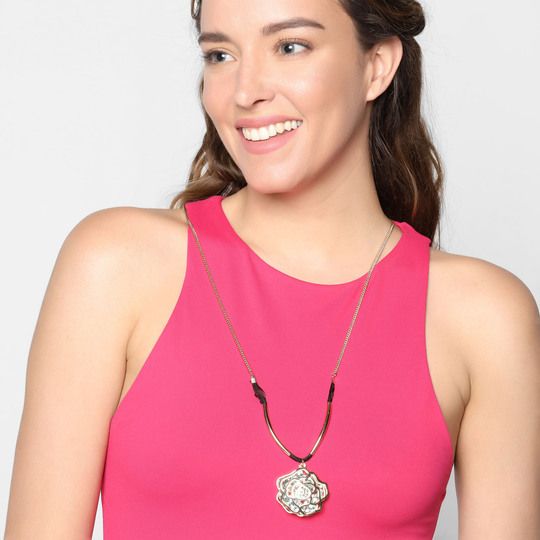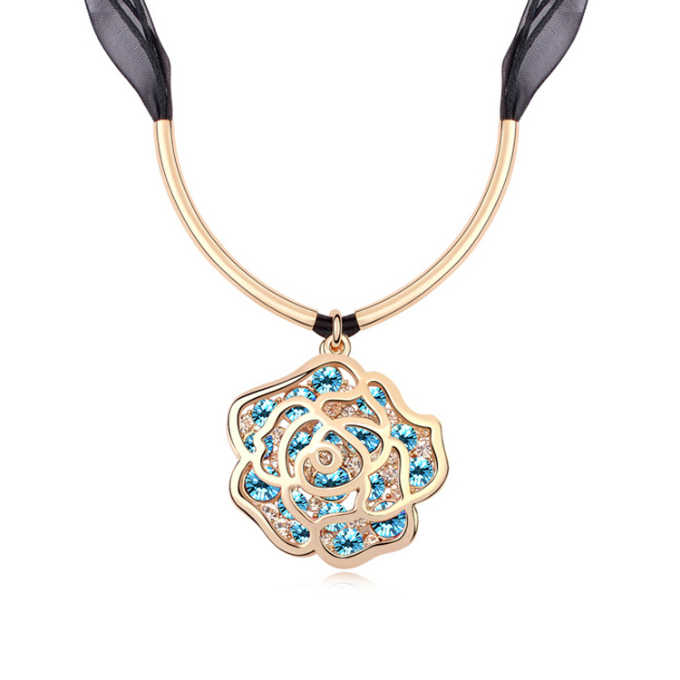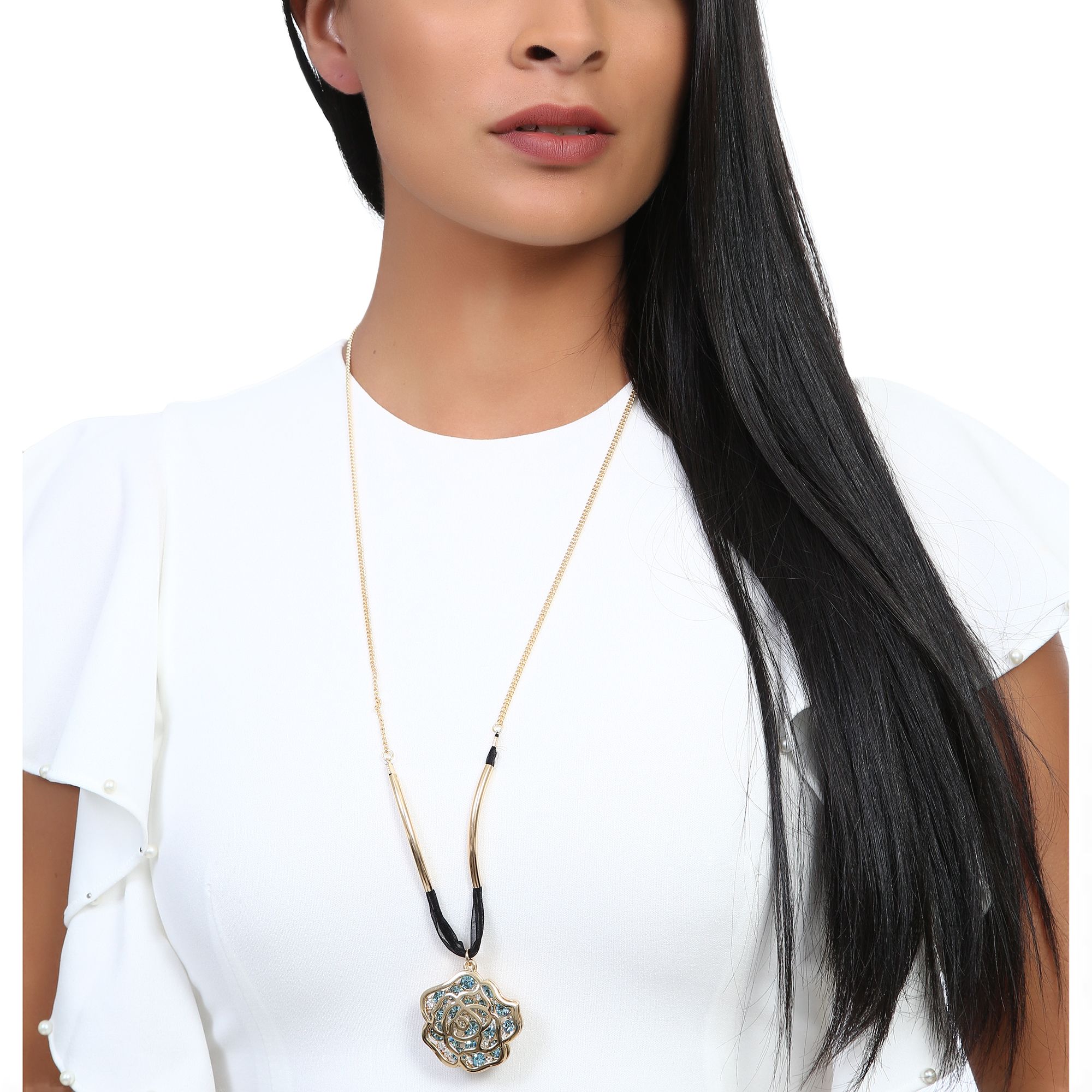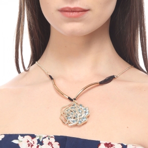 Elegante collar en baño de oro amarillo de 18 quilates, diseño de flor con incrustaciones de finos cristales en color blanco y azul.