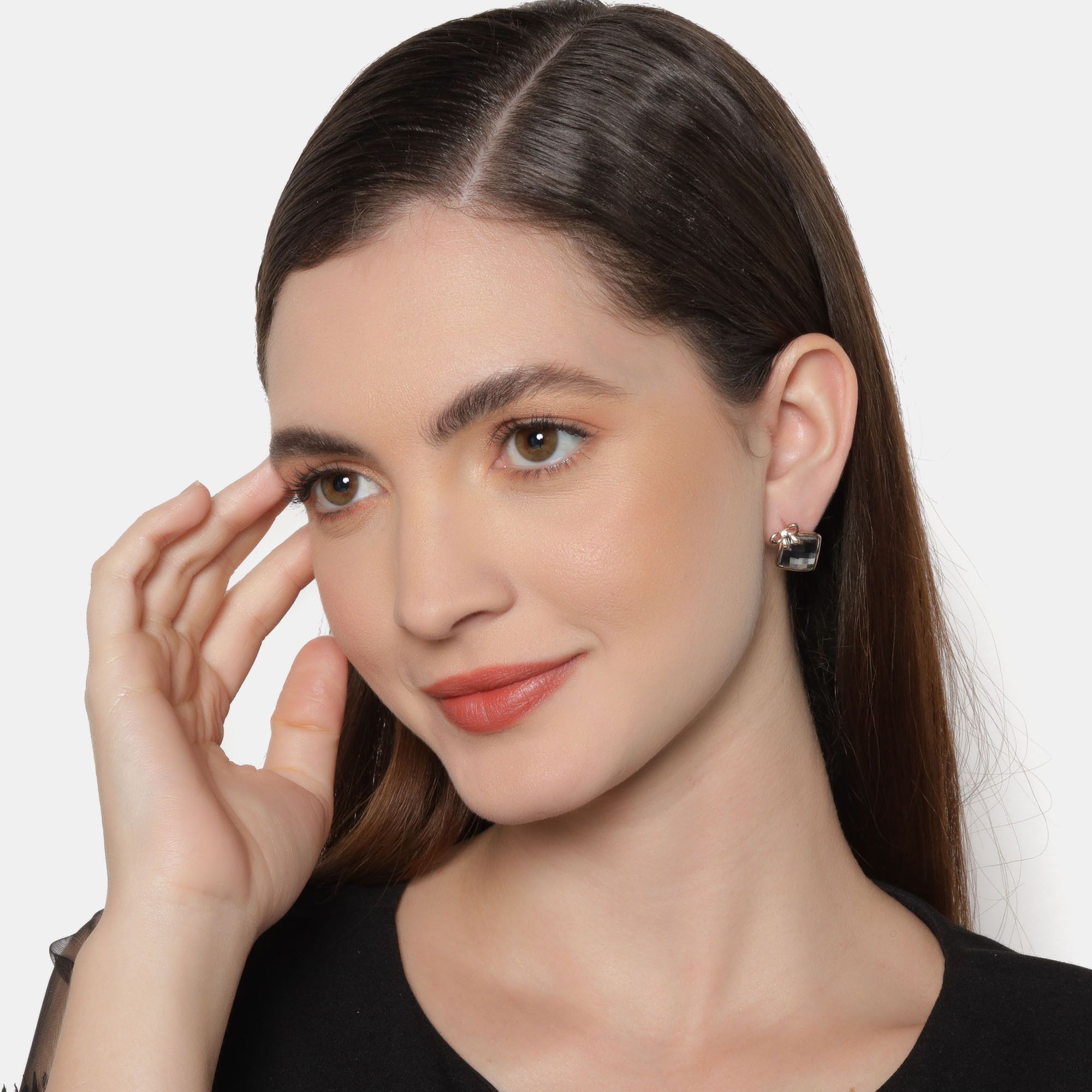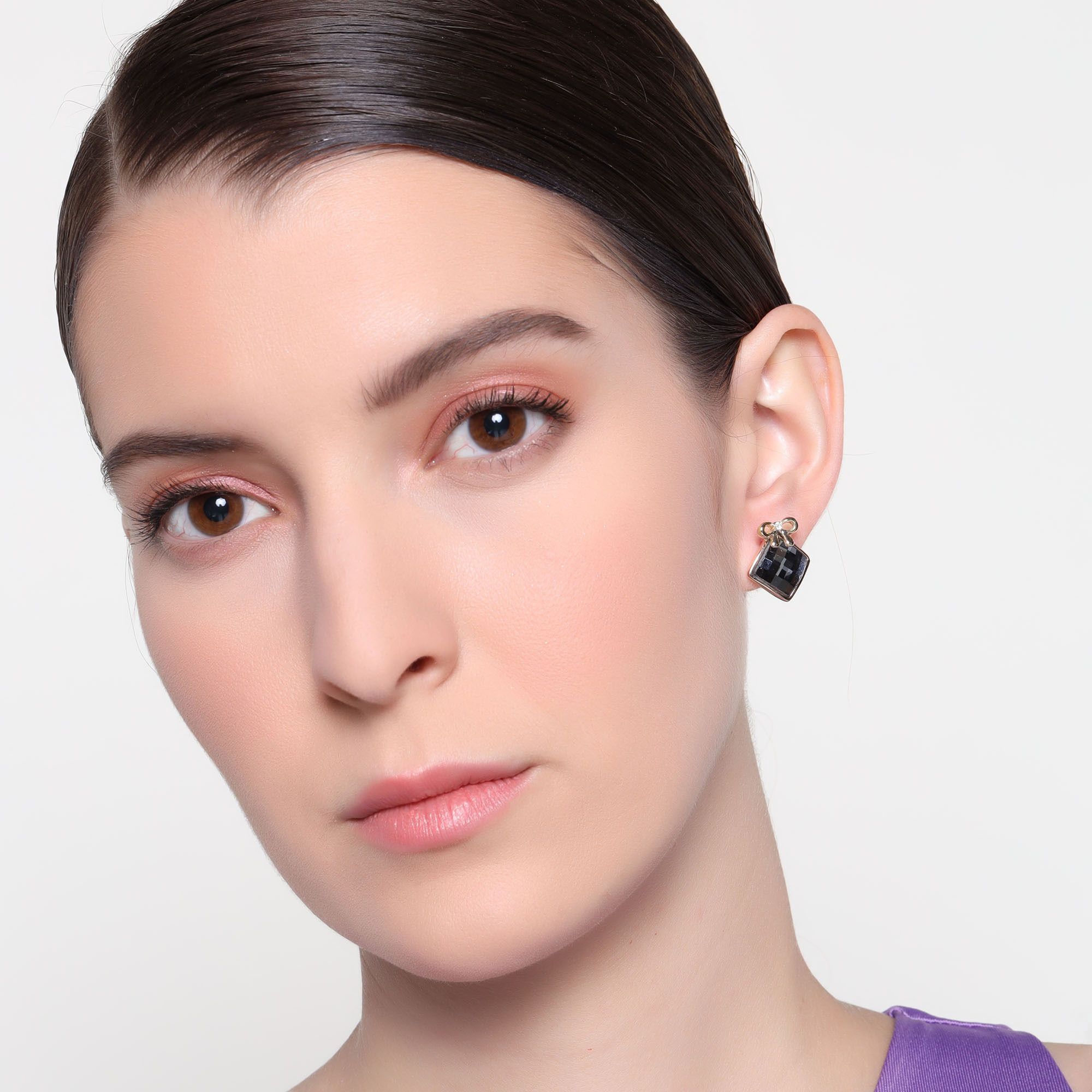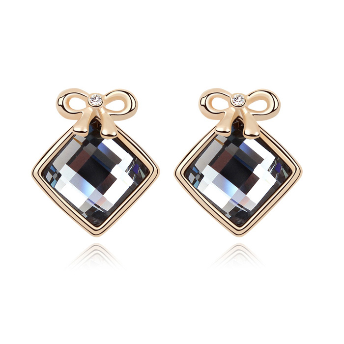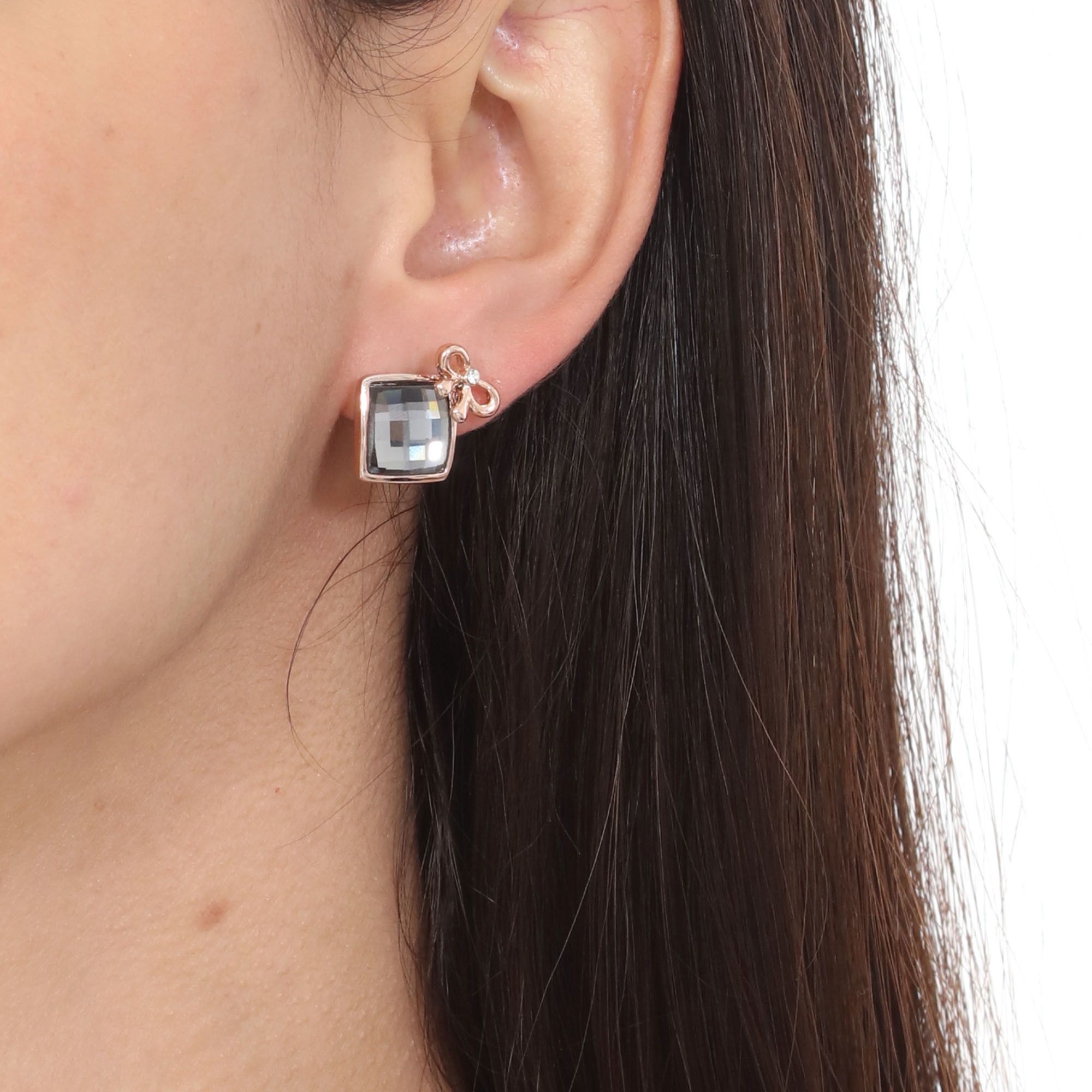 Elegantes aretes en baño de oro rosa de 18 quilates, detalle de moño y cristal en color humo corte cushion. Fabricado en una estructura de aleación de platino con rodio sin níquel
