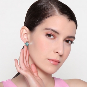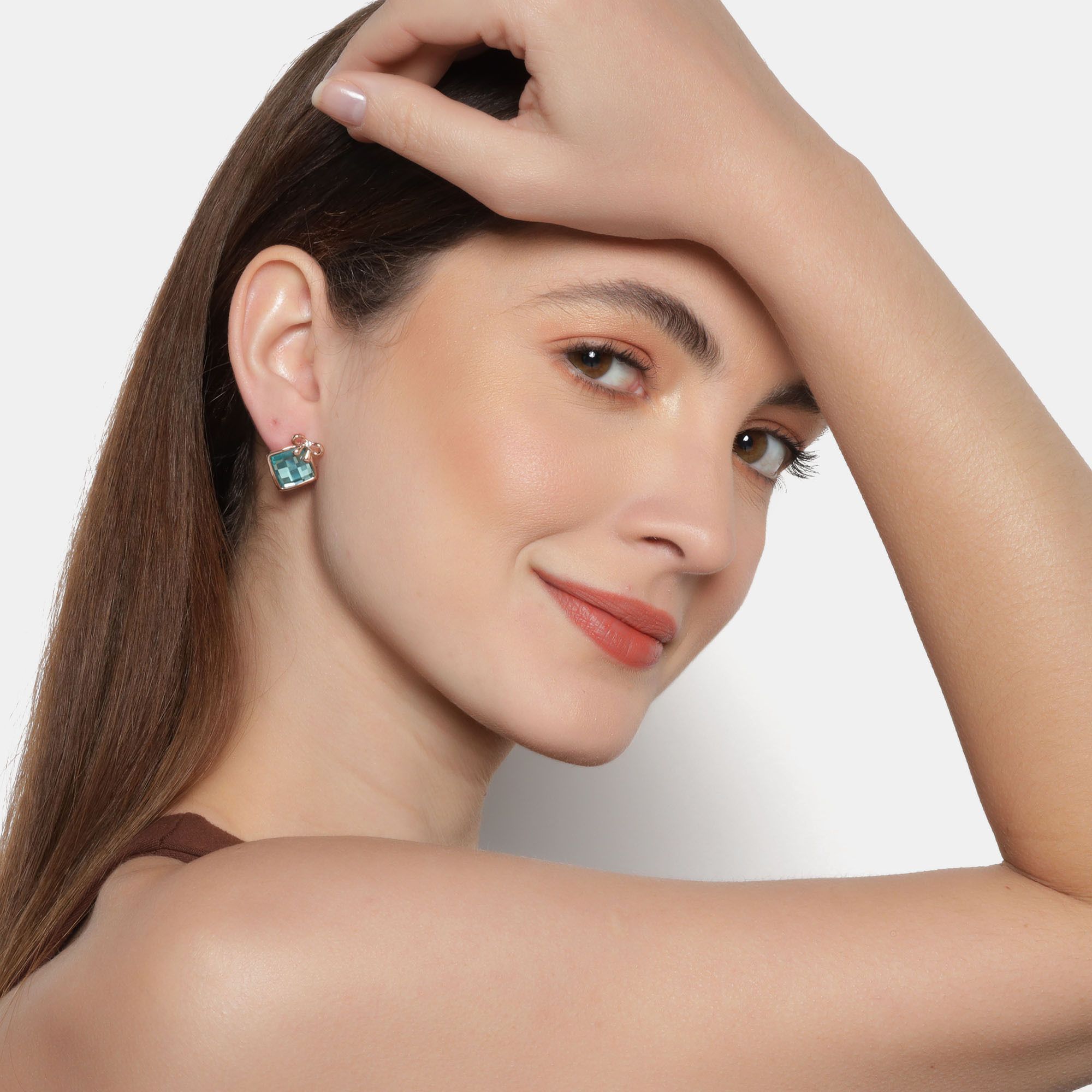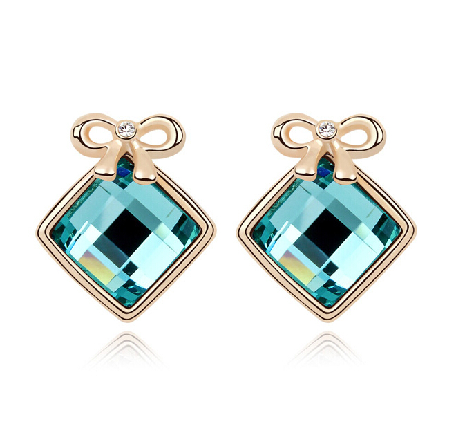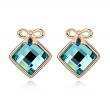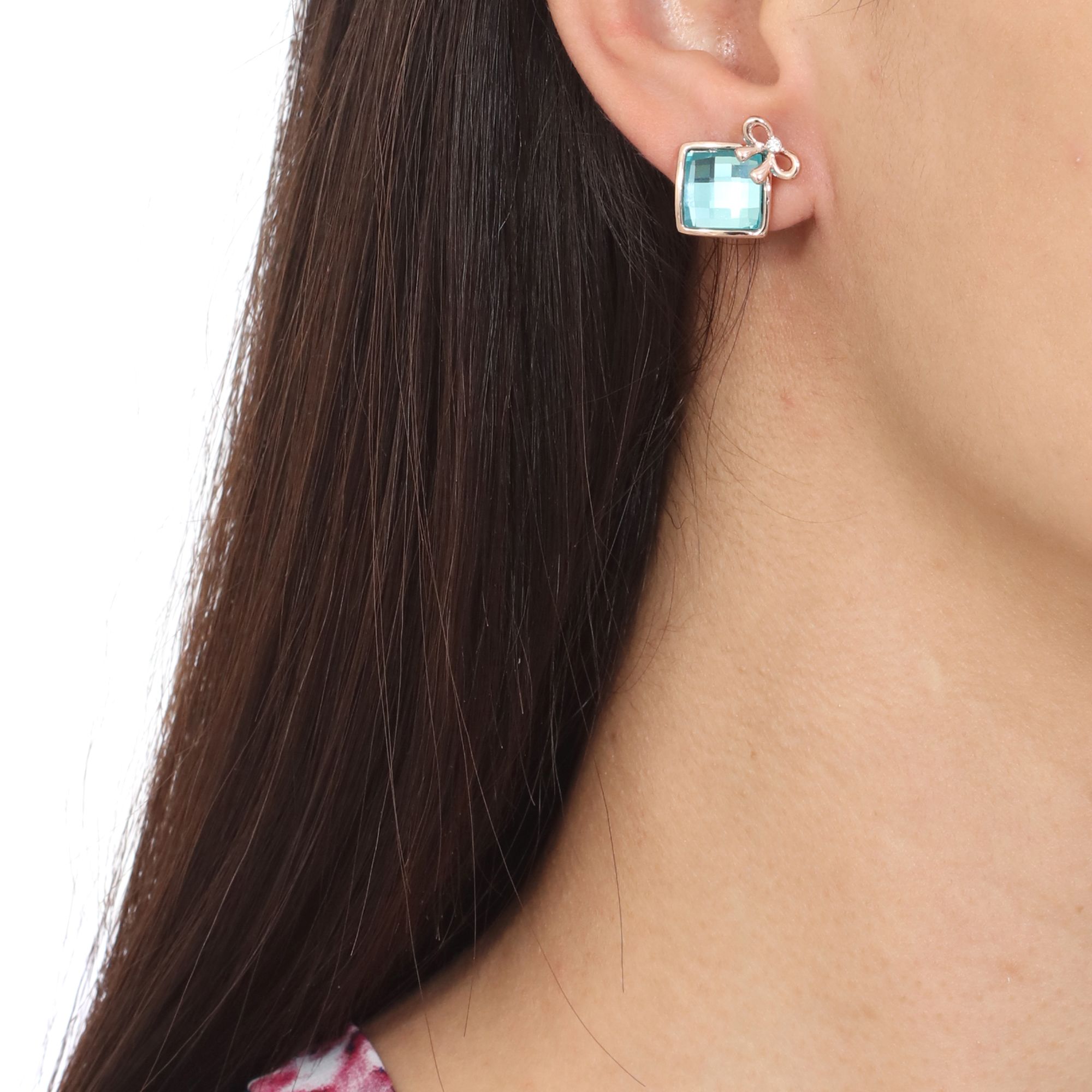 Elegantes aretes en baño de oro rosa de 18 quilates, detalle de moño y cristal en color azul corte cushion. Fabricado en una estructura de aleación de platino con rodio sin níquel