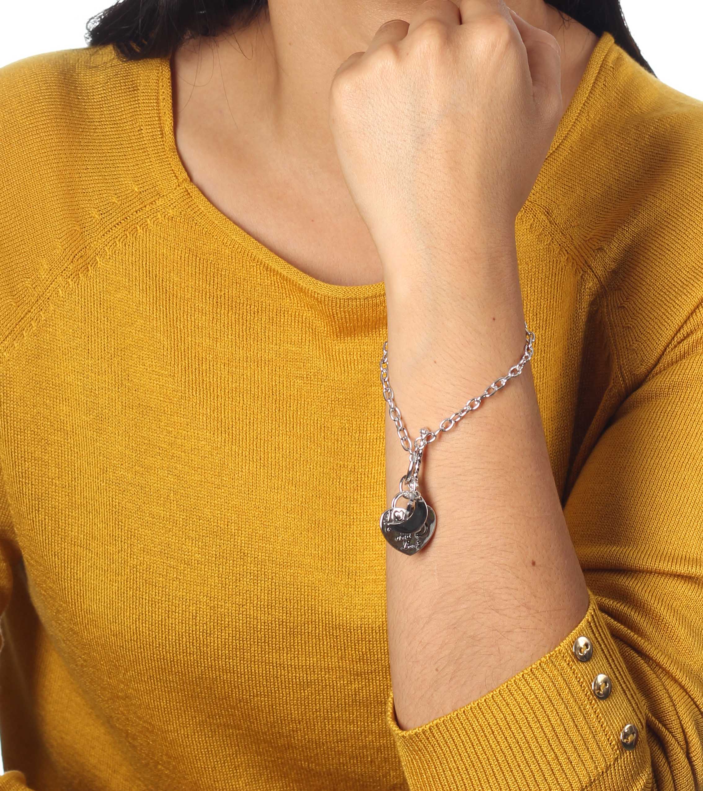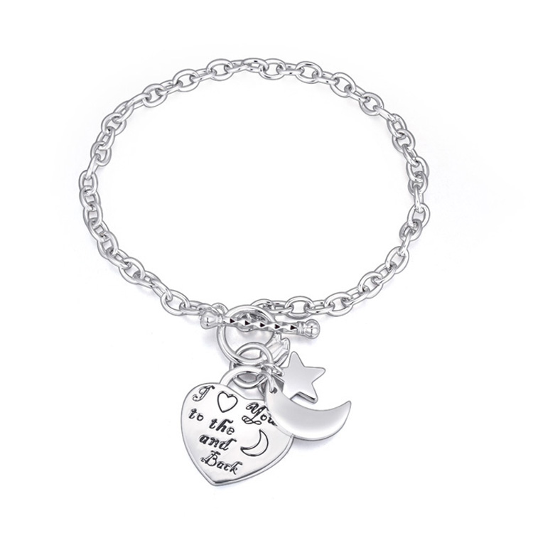 Hermosa pulsera, de acero inoxidable, diseño de corazón y luna, con grabado de leyenda "I ♥ you to the ☾ and back" y colguije de estrella.
