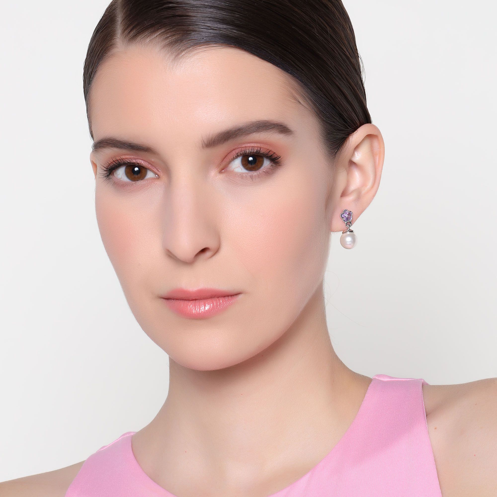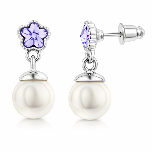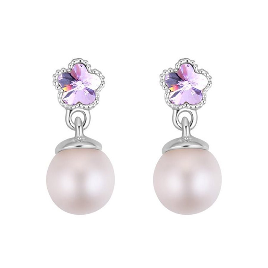 Aretes en baño de oro blanco de 18 quilates, diseño de flor, con perla blanca e incrustación de cristal en color morado. Fabricado en una estructura de aleación de platino con rodio sin níquel