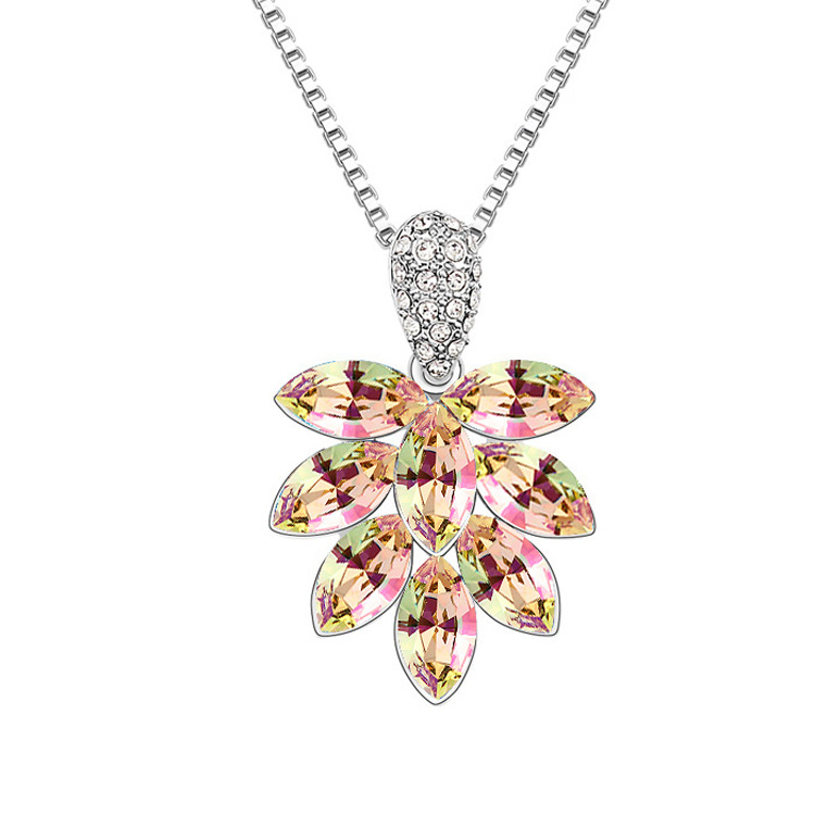 Precioso Collar en baño de oro blanco de 18 quilates, diseño de flor con incrustación de cristales en color blanco y tornasol.