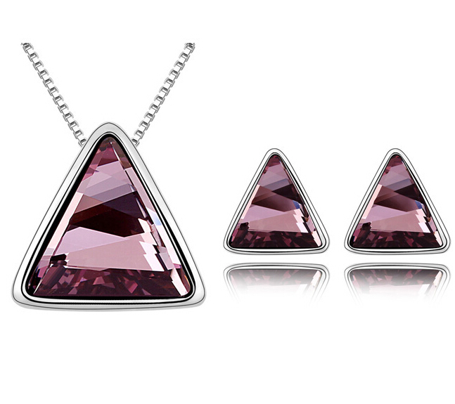 Juego de aretes y dije con cadena en baño de oro blanco de 18 quilates, diseño de triángulo con cristal en color morado.