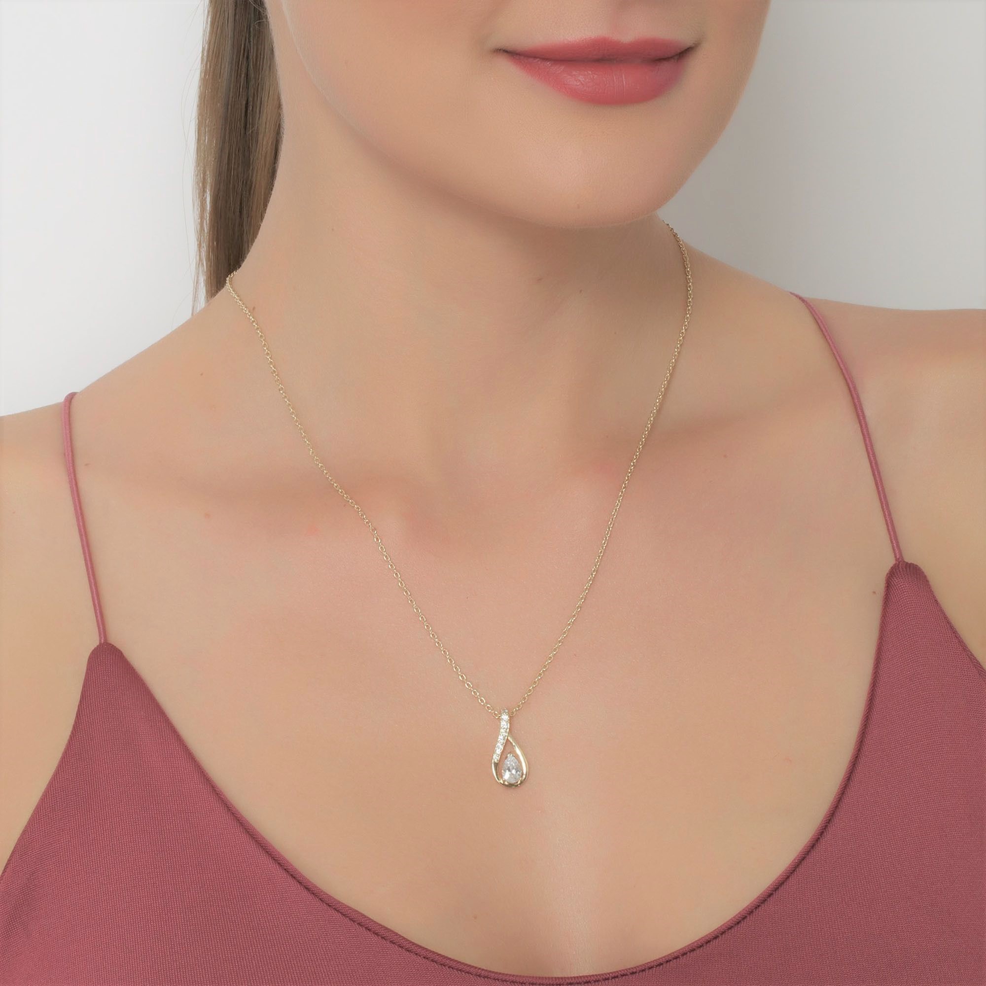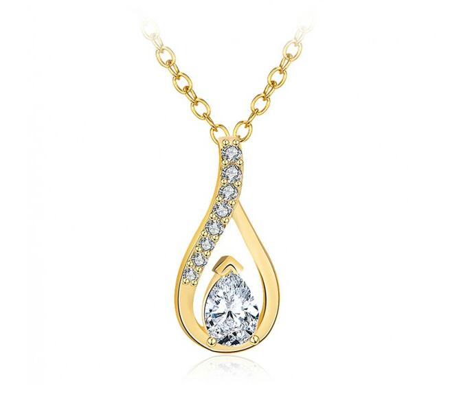 Dije con cadena en baño de oro amarillo de 18 quilates, fino diseño de gota con incrustación de cristales en color blanco. Fabricado en una estructura de aleación de platino con rodio sin níquel 1. joyería Hipoalergénica. 2. Incluye cajita de joyería. 3. Garantía de 30 días por defectos de fabrica.