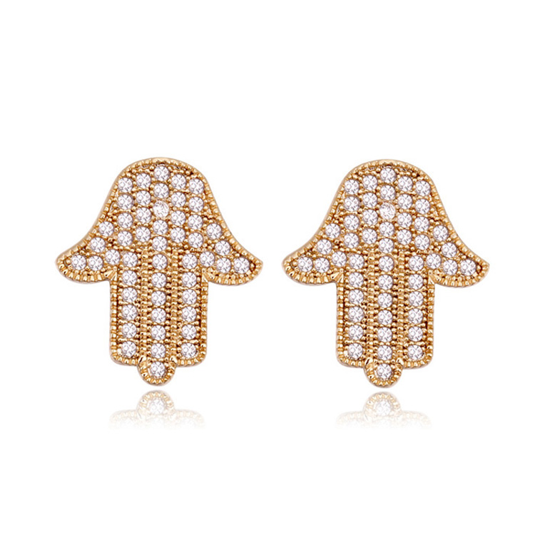 Aretes en baño de oro amarillo de 18 quilates, diseño de Hamsa con incrustación de cristales en color blanco.