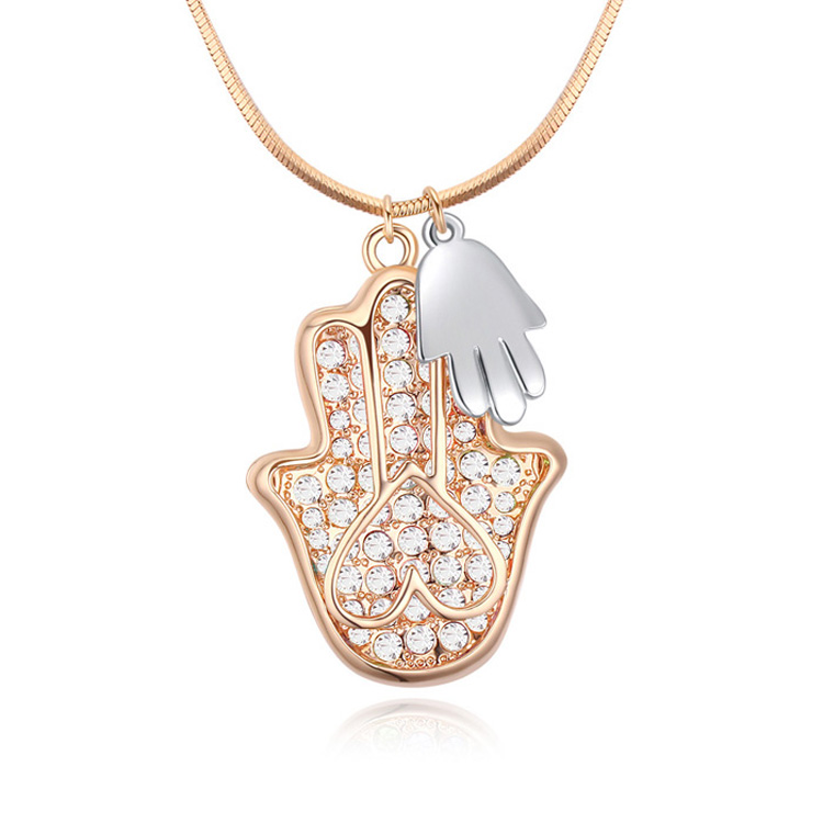 Lindo Collar en baño de oro amarillo de 18 quilates, diseño de hamsa con incrustación de cristales en color blanco. Fabricado en una estructura de aleación de platino con rodio sin níquel 1. joyería Hipoalergénica. 2. Incluye cajita de joyería. 3. Garantía de 30 días por defectos de fabrica.