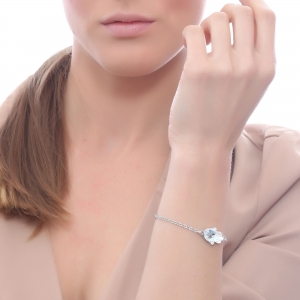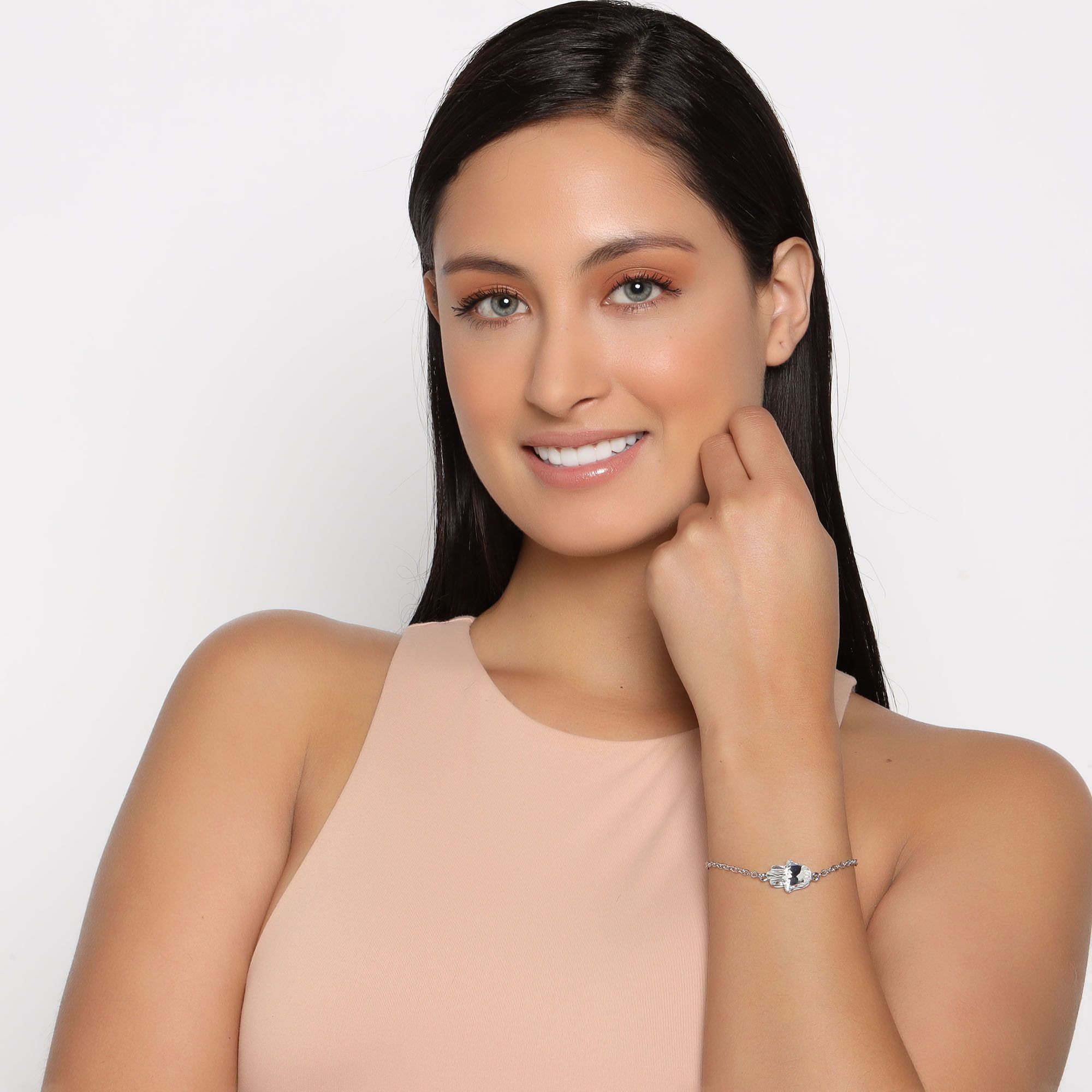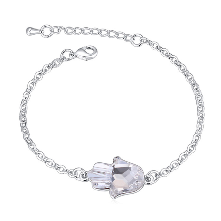 Linda pulsera, en baño de oro blanco de 18 quilates, diseño de mano "Hamsa" en cristal color blanco. Fabricado en una estructura de aleación de platino con rodio sin níquel.
