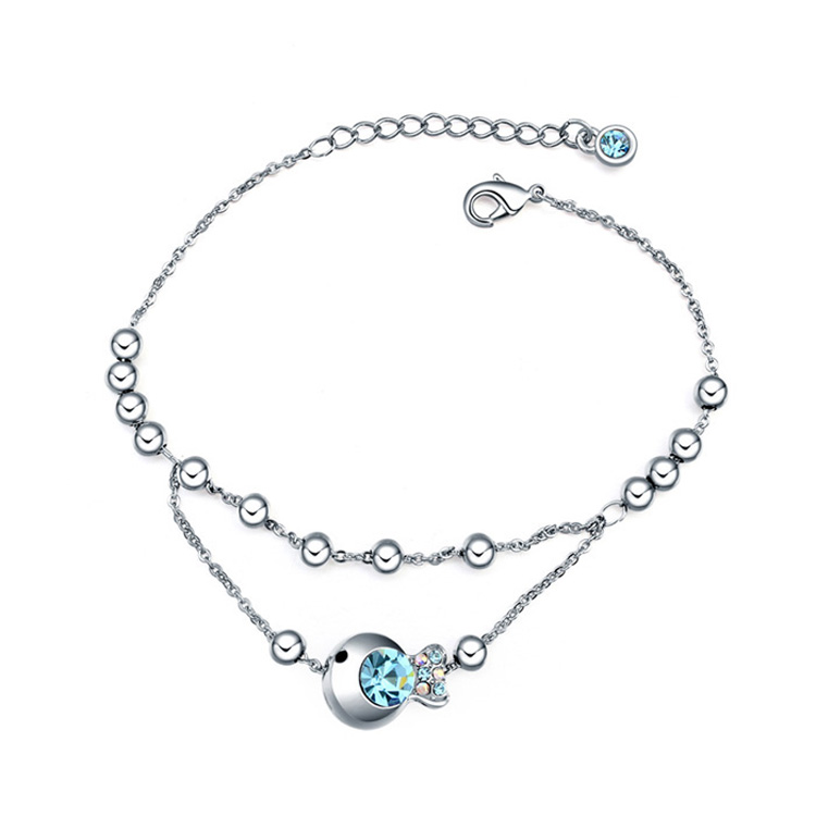 Pulsera en baño de oro blanco de 18 quilates, diseño de pez, con incrustaciones de cristales en azul y negro.