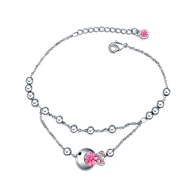 Pulsera en baño de oro blanco de 18 quilates, diseño de pez, con incrustaciones de cristales en rosa y negro.