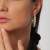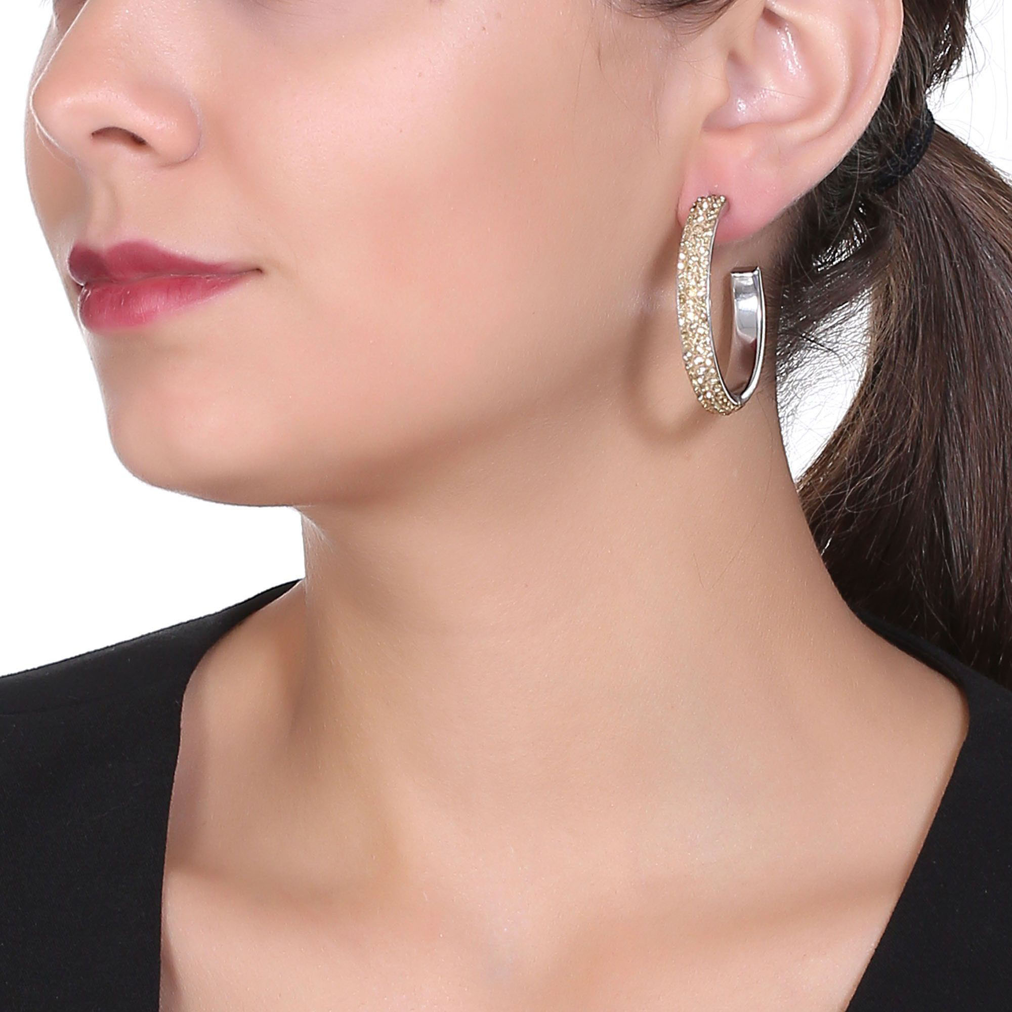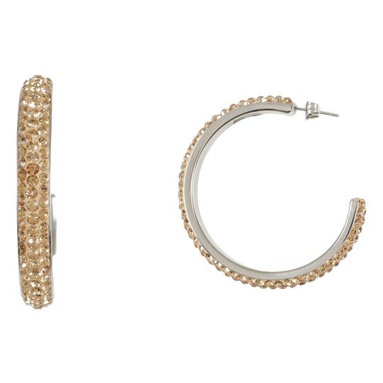 Arracadas en acero inoxidable, con fondo beige e incrustación de cristales en color ámbar.
