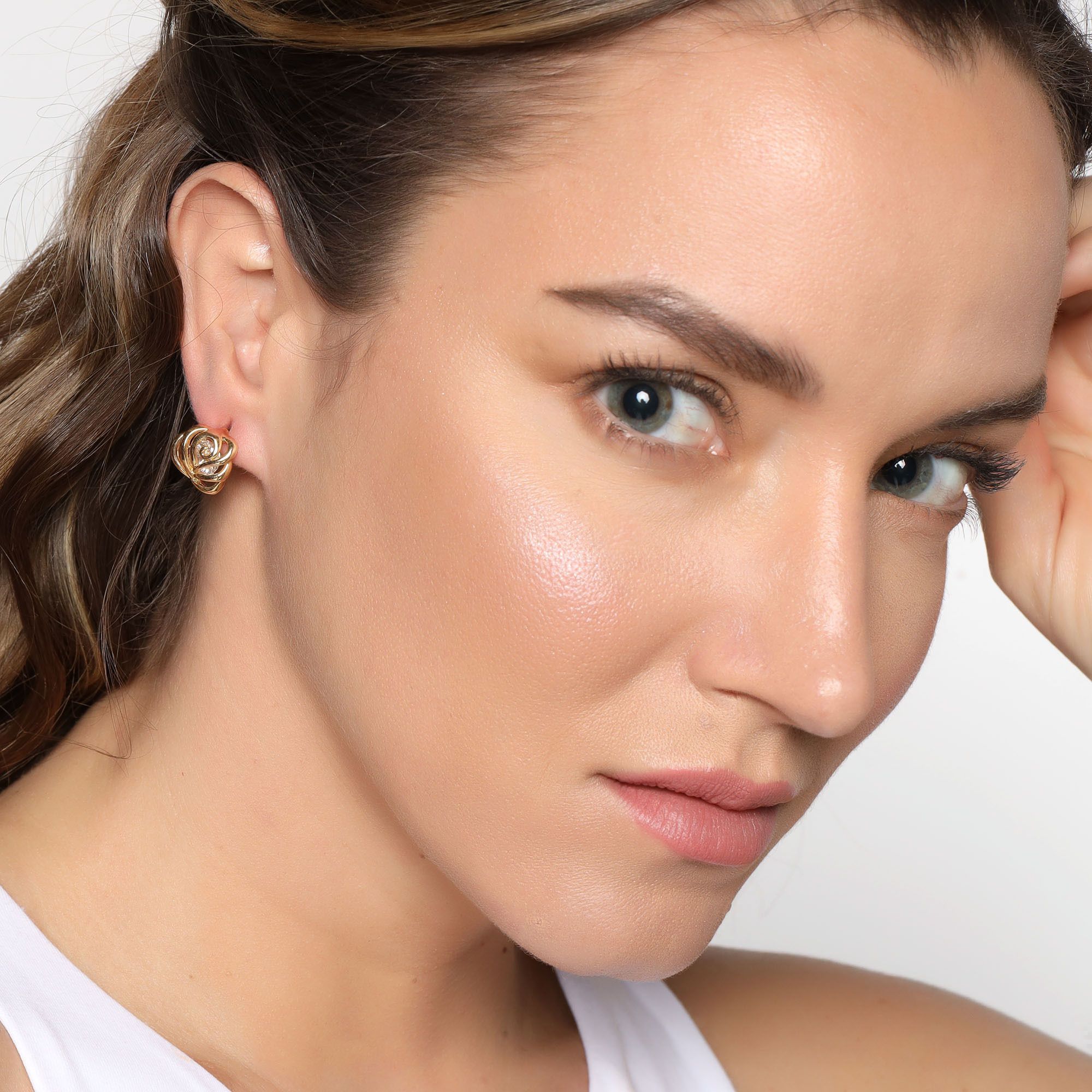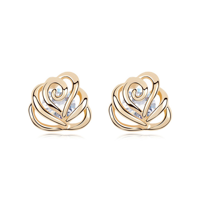 Preciosos aretes, en baño de oro amarillo de 18 quilates, diseño de flor calada, con cristales blancos dentro. Fabricado en una estructura de aleación de platino con rodio sin níquel