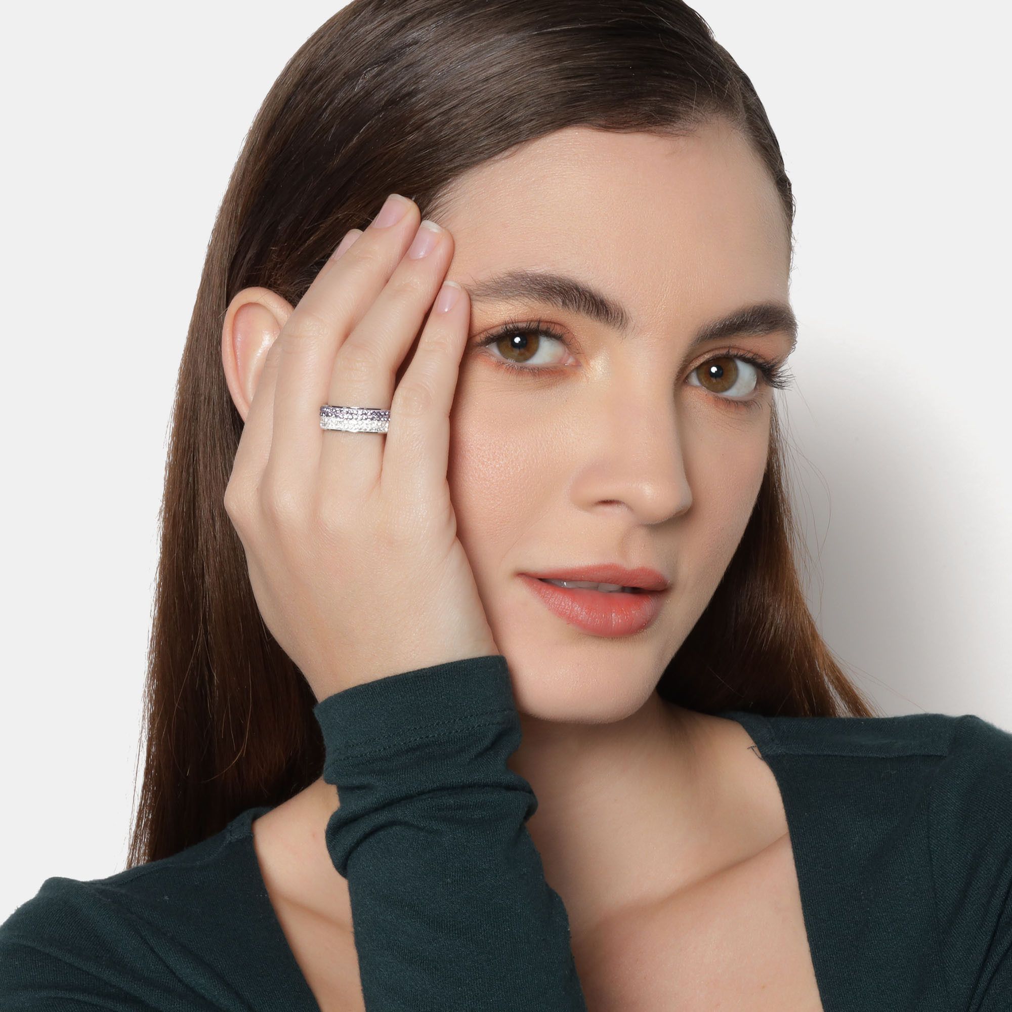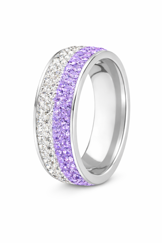 Anillo en acero inoxidable, sofisticado diseño, con fondo blanco y morado e incrustaciones de cristales en color blanco y morado.