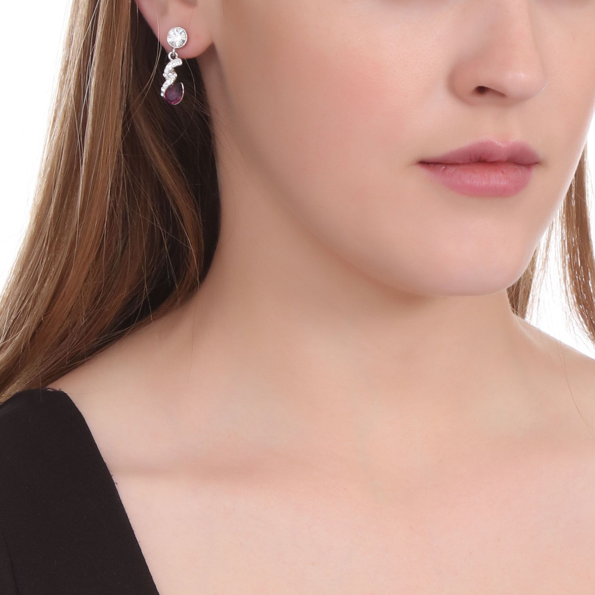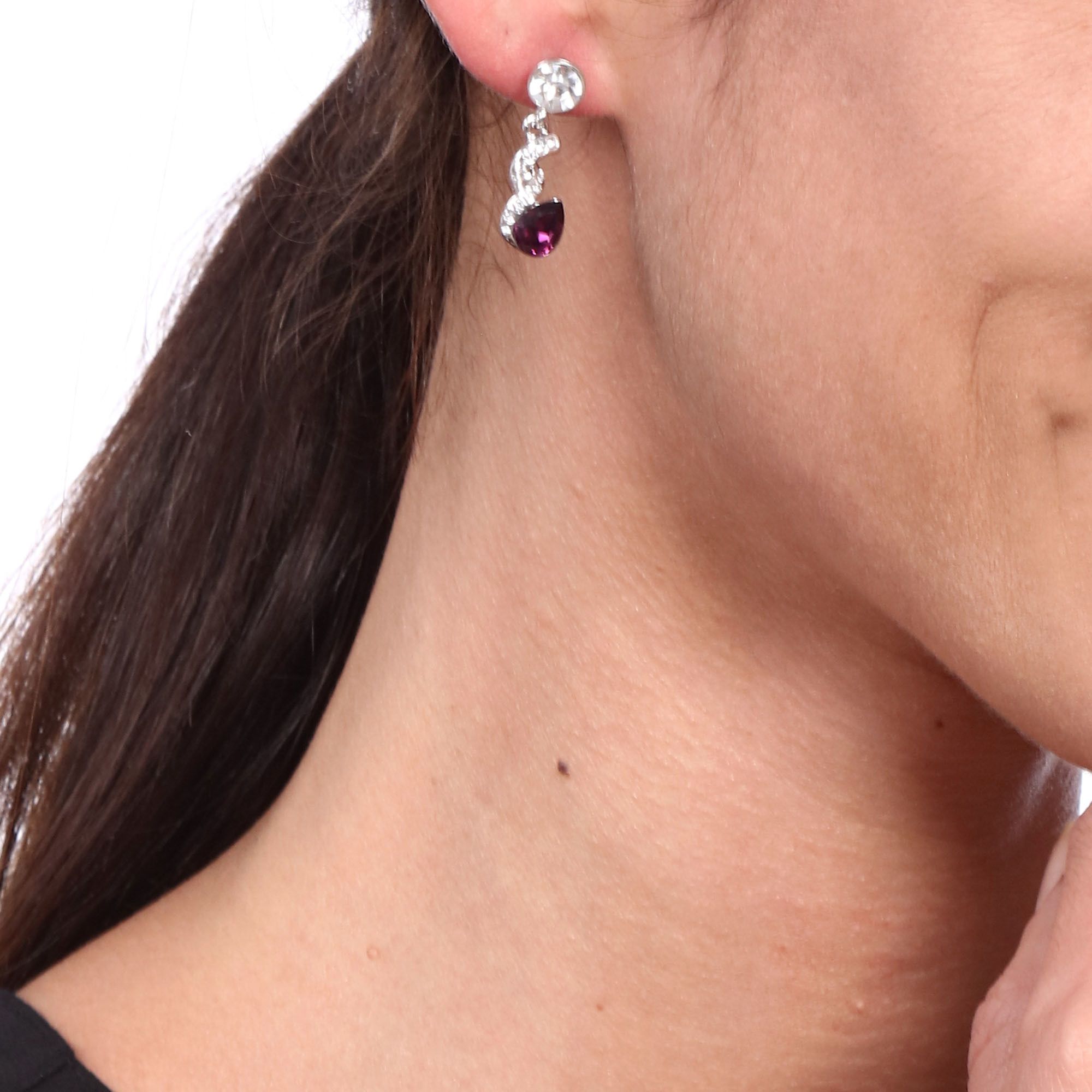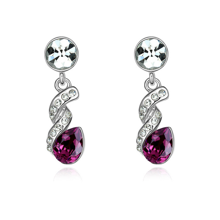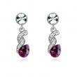 Elegantes aretes en baño de oro blanco de 18 quilates, diseño de espiral, con cristal morado corte pera e incrustación de cristales blancos. Fabricado en una estructura de aleación de platino con rodio sin níquel
