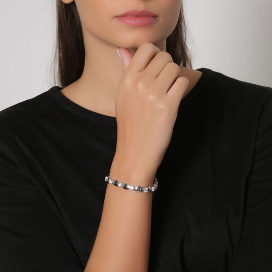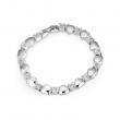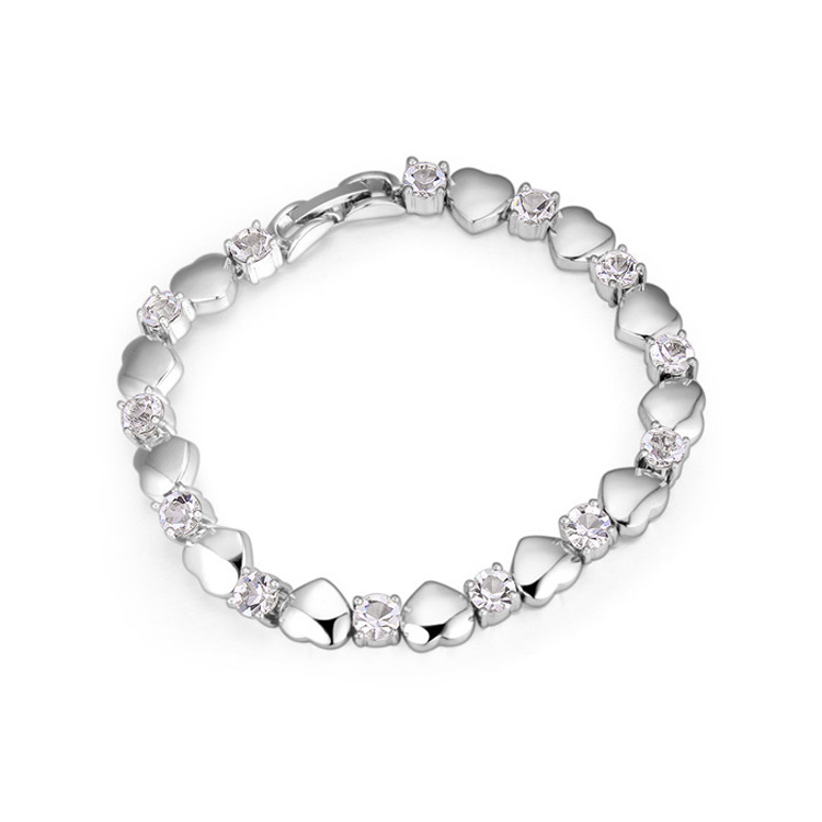 Elegante pulsera, en baño de oro blanco de 18 quilates, diseño de corazones e incrustaciones de cristales en color blanco.