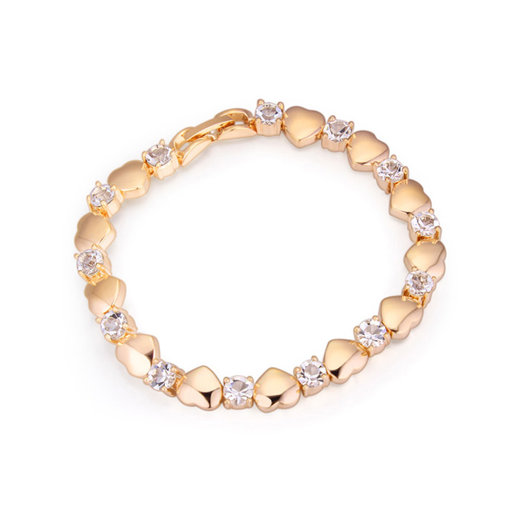 Elegante pulsera, en baño de oro amarillo de 18 quilates, diseño de corazones e incrustaciones de cristales en color blanco.