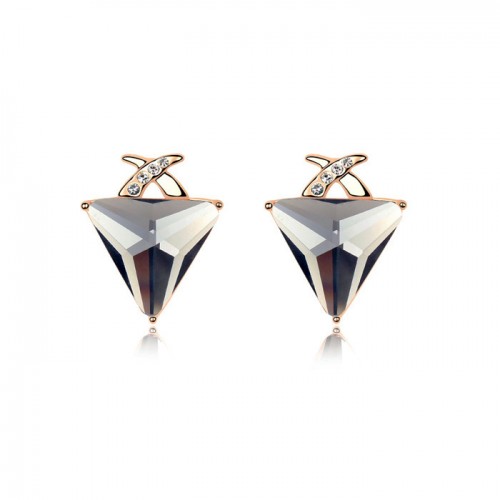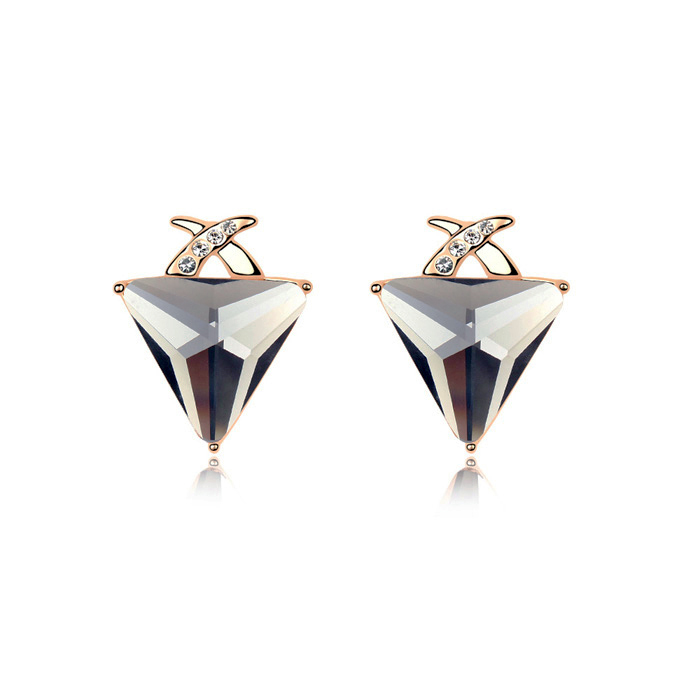 Preciosos Aretes, en baño de oro blanco de 18 quilates, elegante diseño, con detalle plateado en forma de "X", cristal color humo corte trillion y chispas de cristales blancos. Fabricado en una estructura de aleación de platino con rodio sin níquel
