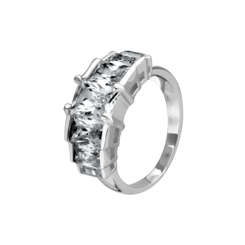Anillo en baño de oro blanco de 18 quilates, fino diseño, con incrustaciones de cristales en color blanco corte baguette.