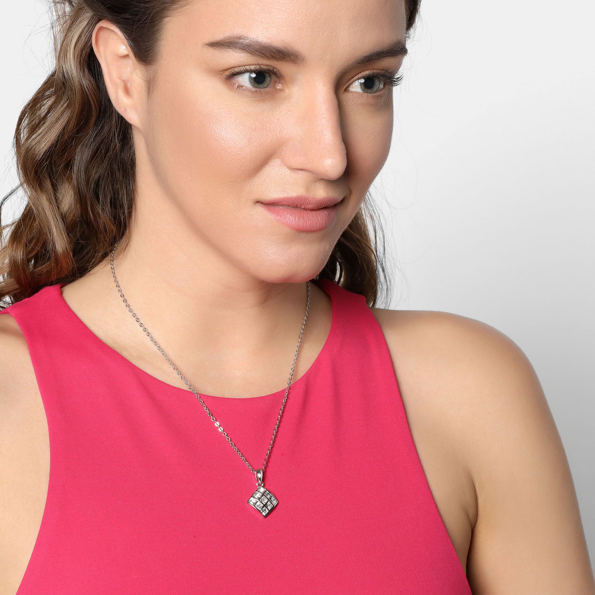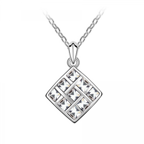 Dije en baño de oro blanco de 18 quilates, diseño de rombo con incrustación de cristales en color blanco. Fabricado en una estructura de aleación de platino con rodio sin níquel. 1. joyería Hipoalergénica. 2. Incluye cajita de joyería. 3. Garantía de 30 días por defectos de fabrica.