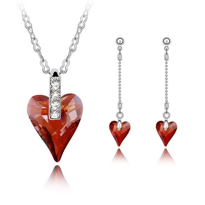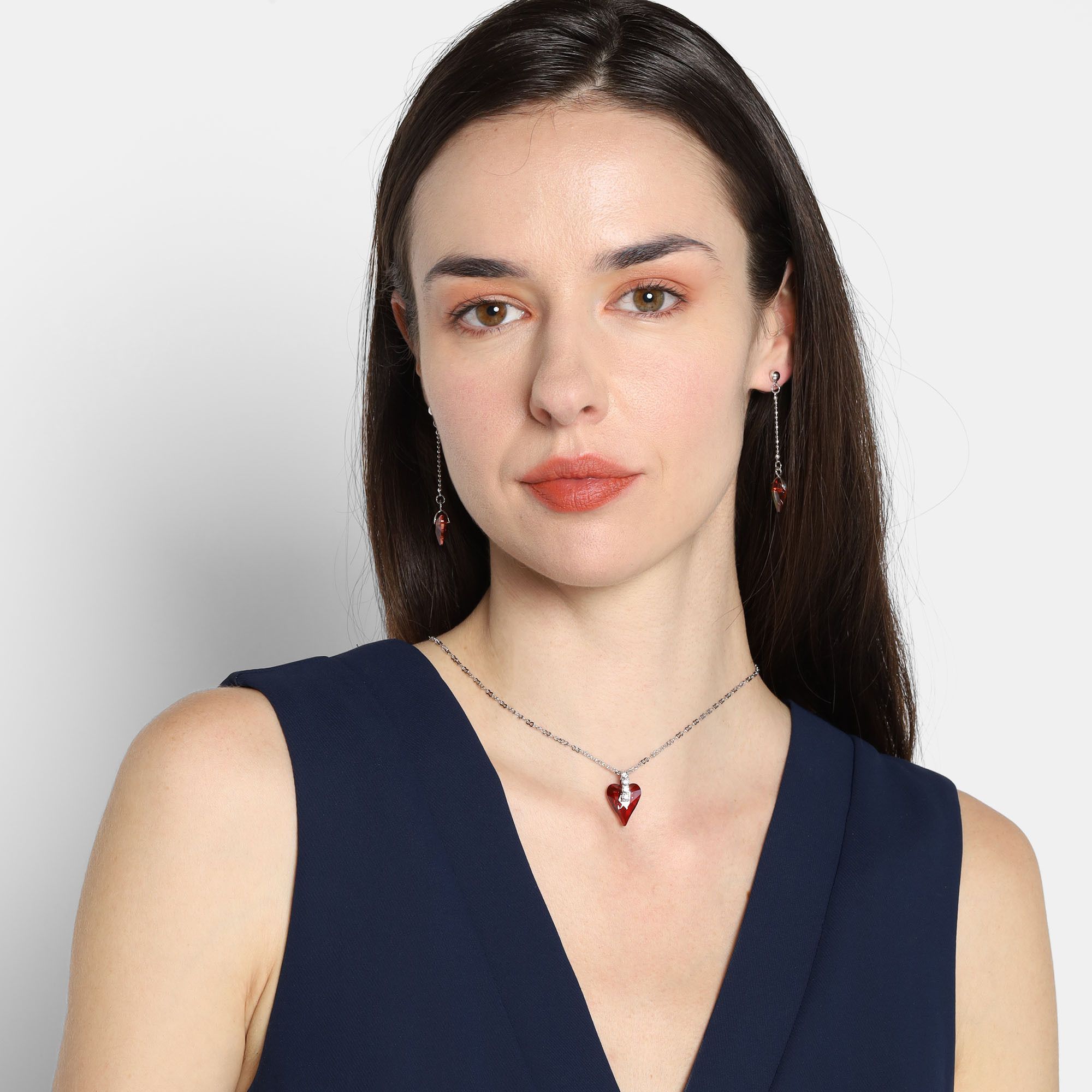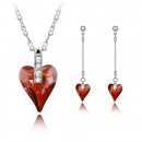 Juego de aretes y dije en baño de oro blanco de 18 quilates, diseño de corazón largo con incrustación de cristales en color rojo y blanco. cadena de 40 cm, con extención de 5 cm.
