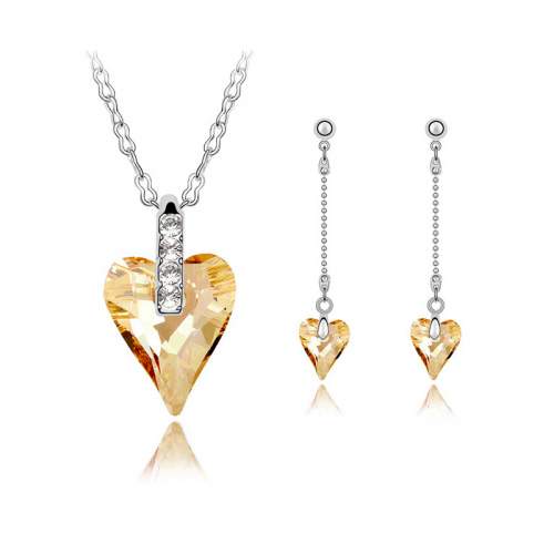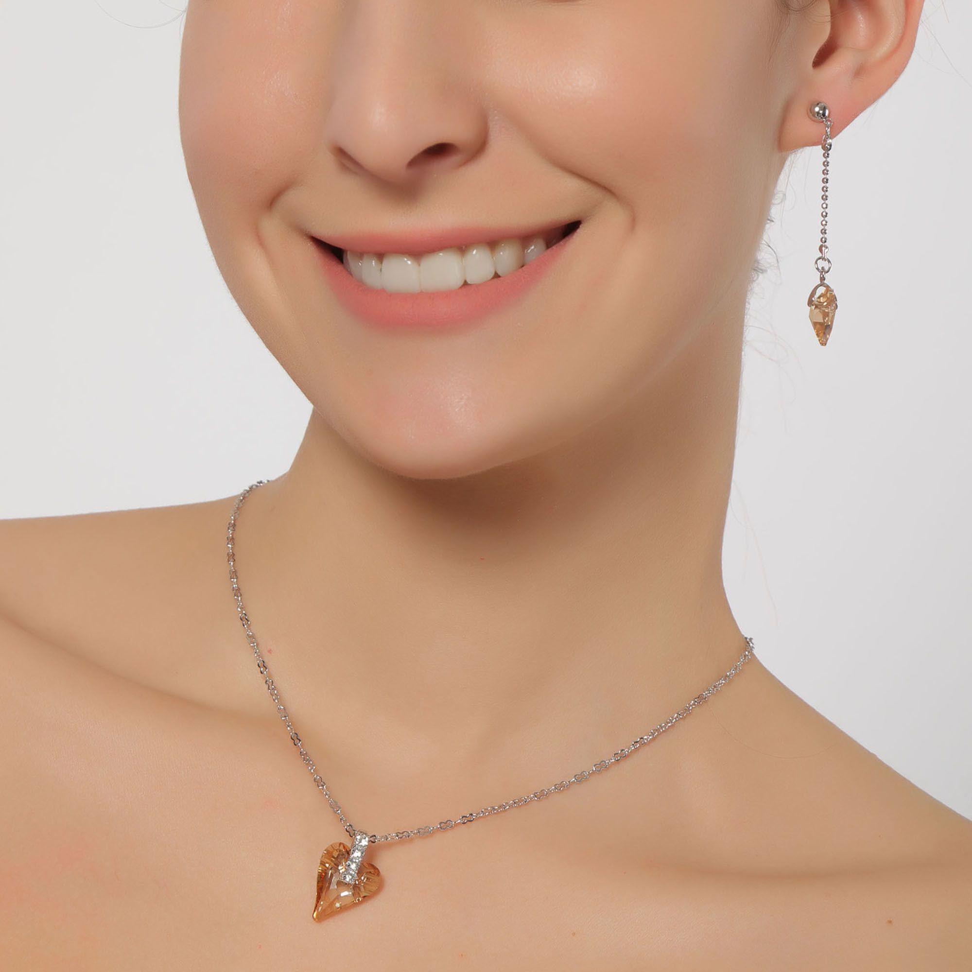 Juego de aretes y dije en baño de oro blanco de 18 quilates, diseño de corazón largo con incrustación de cristales en color ámbar y blanco. cadena de 40 cm, con extención de 5 cm.