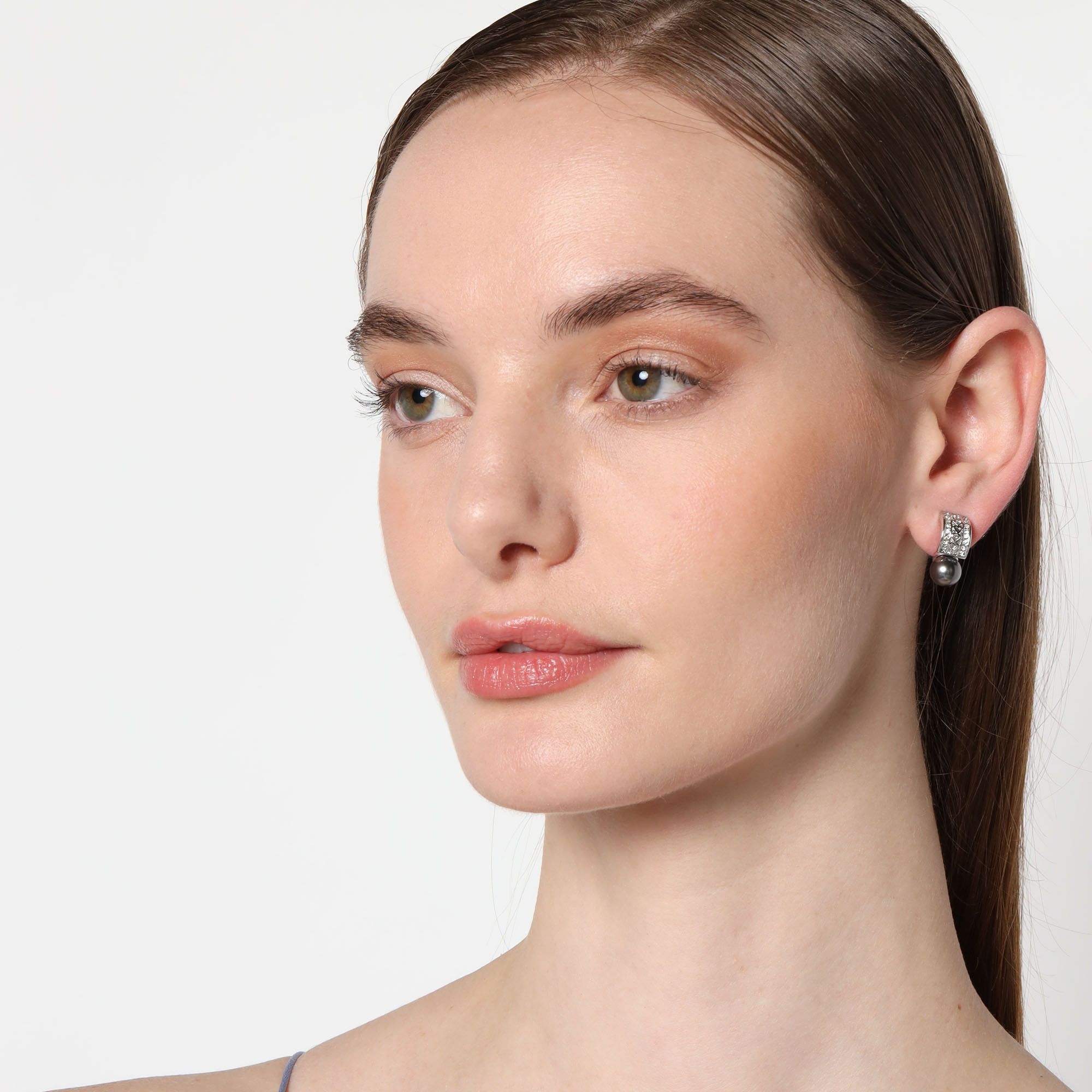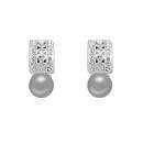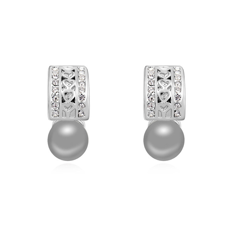 Arracadas en baño de oro blanco de 18 quilates, diseño de corazones en relieve, con perla gris e incrustación de cristales blancos. Fabricado en una estructura de aleación de platino con rodio sin níquel