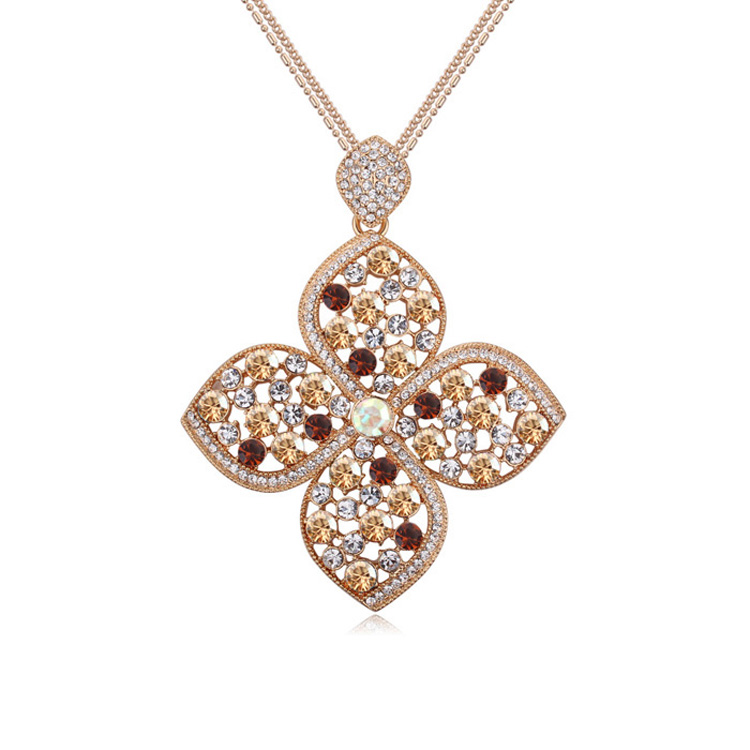 Collar para Sweater en baño de oro amarillo de 18 quilates, diseño de flor con cristales tonos ámbar, guinda y blanco.