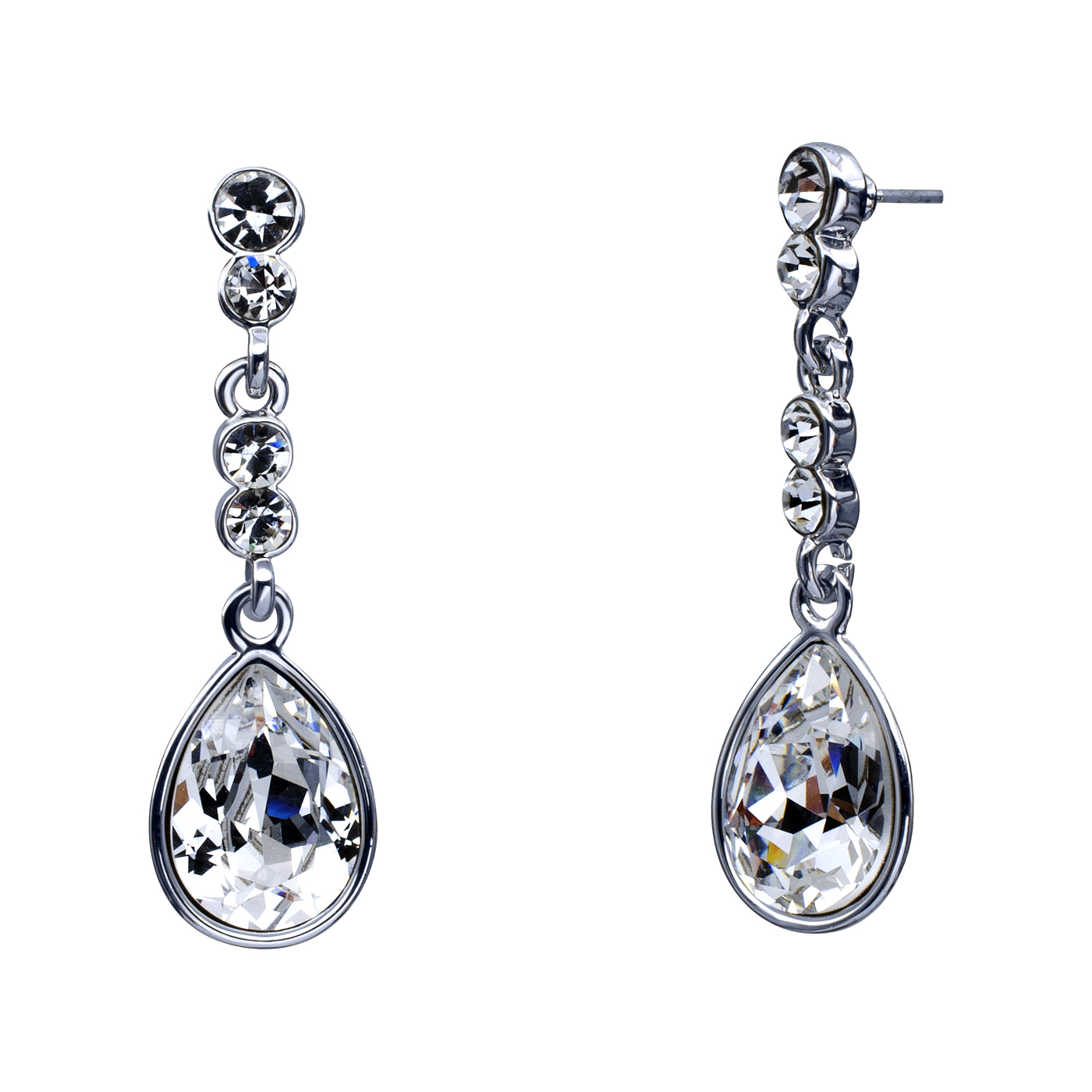 Preciosos aretes, en baño de oro blanco de 18 quilates, elegante diseño, con cristal blanco corte pera e incrustación de cristales blancos.