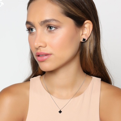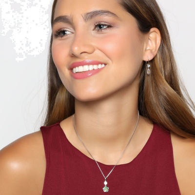 Exquisito conjunto de dije con cadena y aretes en baño de oro blanco de 18 quilates, diseño de flores en esmaltado