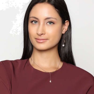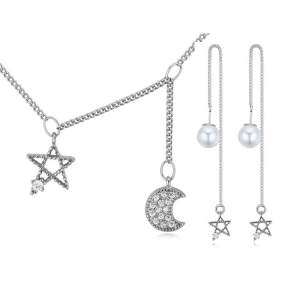 Moderno conjunto de dije con cadena y pendientes en baño de oro blanco de 18 quilates, diseño de luna y