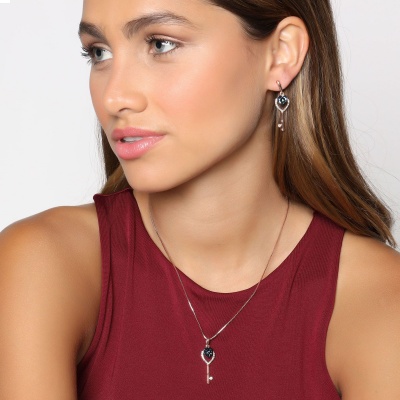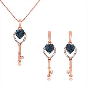 Tierno conjunto de dije con cadena y aretes en baño de oro rosa de 18 quilates, diseño de llave en