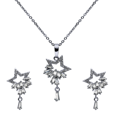 Bello conjunto de dije con cadena y aretes en baño de oro blanco de 18 quilates, diseño de estrellas con