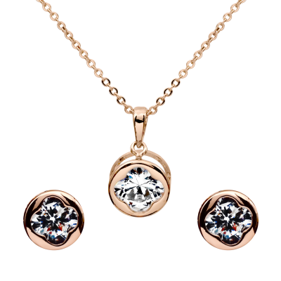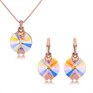 Bello conjunto de dije con cadena y aretes en baño de oro rosa de 18 quilates, diseño circular con cristales