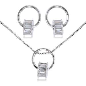 Bonito conjunto de dije con cadena y aretes en baño de oro blanco de 18 quilates, diseño de círculos con