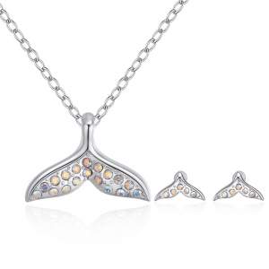 Original conjunto de dije con cadena y aretes en baño de oro blanco de 18 quilates, diseño de cola de