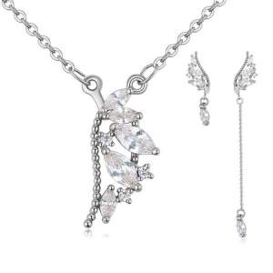 Exclusivo conjunto de dije con cadena y aretes en baño de oro blanco de 18 quilates, diseño de alas, con