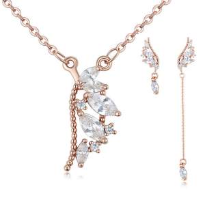 Precioso conjunto de dije con cadena y aretes en baño de oro rosa de 18 quilates, diseño de alas de
