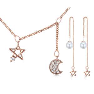 Moderno conjunto de dije con cadena y pendientes en baño de oro rosa de 18 quilates, diseño de luna y