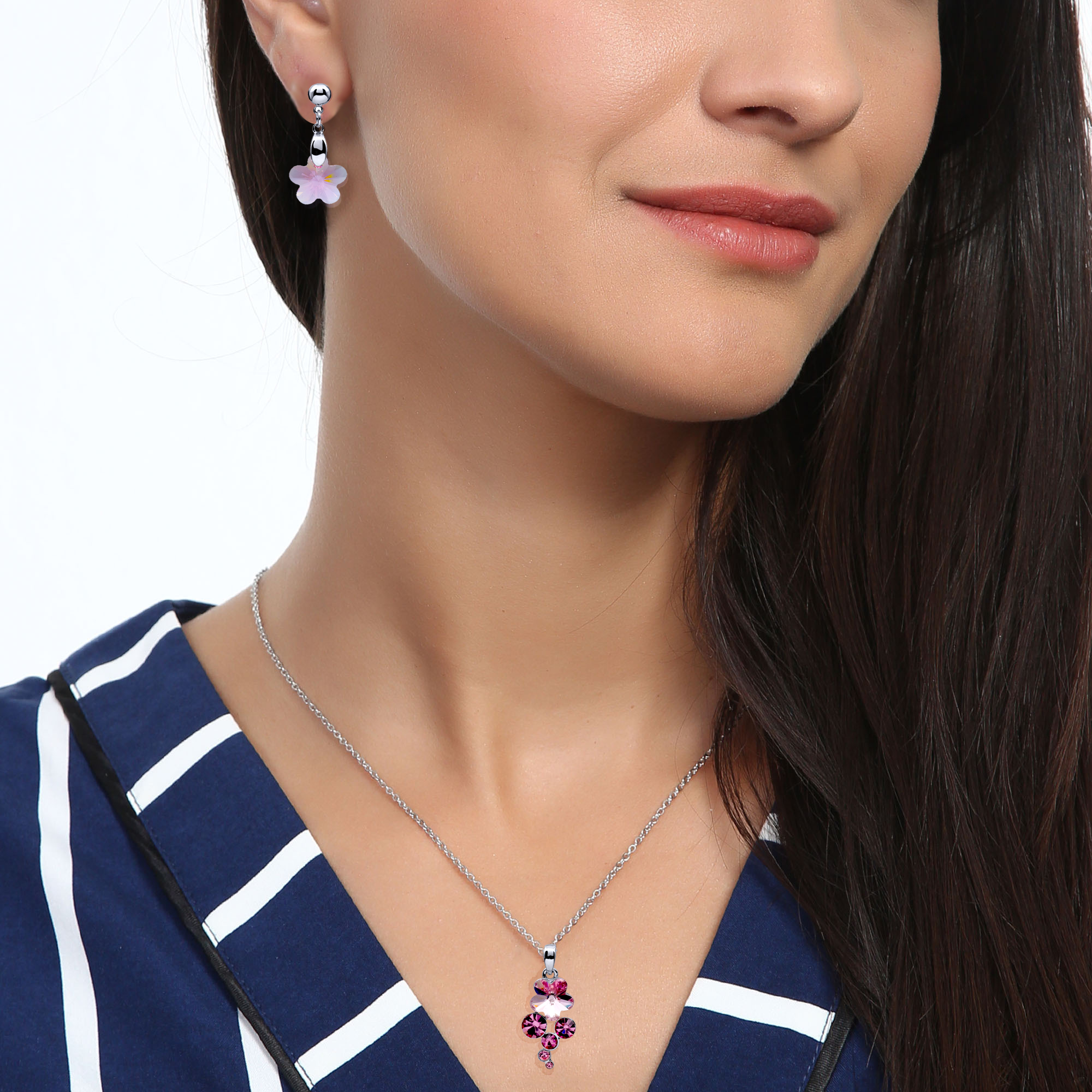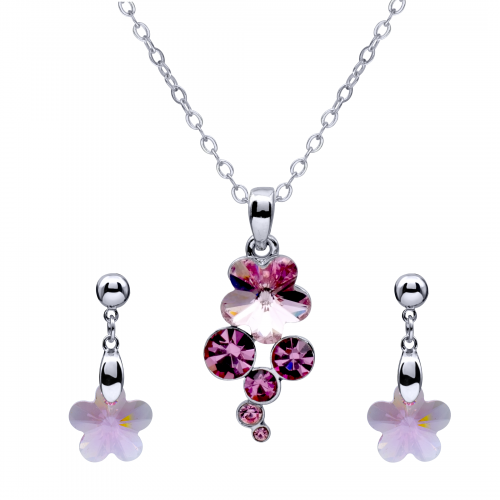 Lindo set de aretes y dije con cadena en baño de oro blanco de 18 quilates, diseño de flor en cristal color rosa.