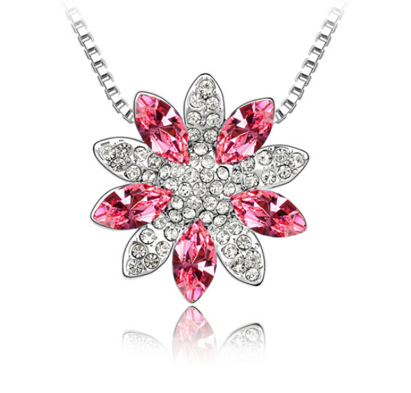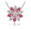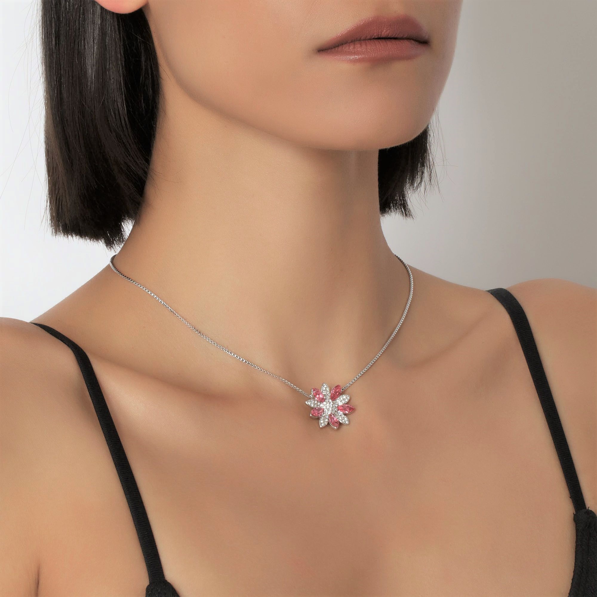 Dije con cadena en baño de oro blanco de 18 quilates, diseño de flores con incrustación de cristales en color blanco y rosa. Fabricado en una estructura de aleación de platino con rodio sin níquel 1. joyería Hipoalergénica. 2. Incluye cajita de joyería. 3. Garantía de 30 días por defectos de fabrica.