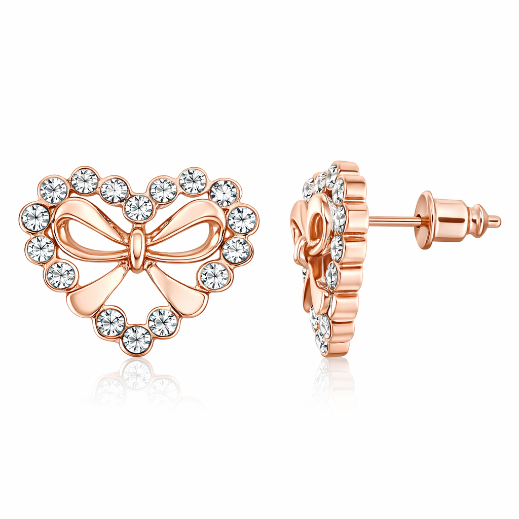 Lindos aretes en baño de oro rosa de 18 quilates, diseño de corazón, con moño rosado en relieve e incrustación de cristales en color blanco.