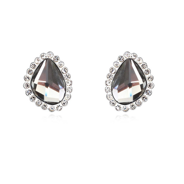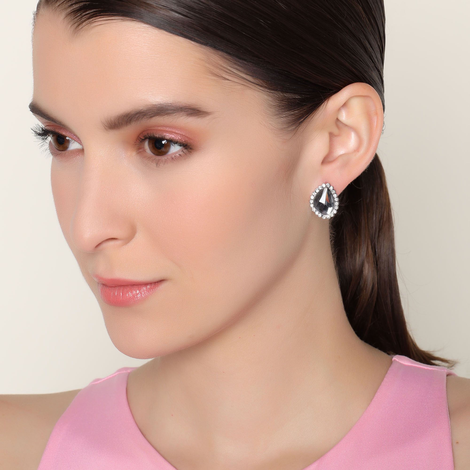 Elegantes aretes en baño de oro rosa de 18 quilates, exquisito diseño, con cristal humo corte asimétrico e incrustación de cristales blancos. Fabricado en una estructura de aleación de platino con rodio sin níquel.