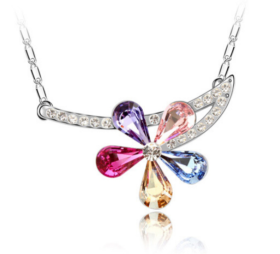 Precioso Collar en baño de oro blanco de 18 quilates, diseño de flor con incrustación de cristales en colores. Fabricado en una estructura de aleación de platino con rodio sin níquel 1. joyería Hipoalergénica. 2. Incluye cajita de joyería. 3. Garantía de 30 días por defectos de fabrica.